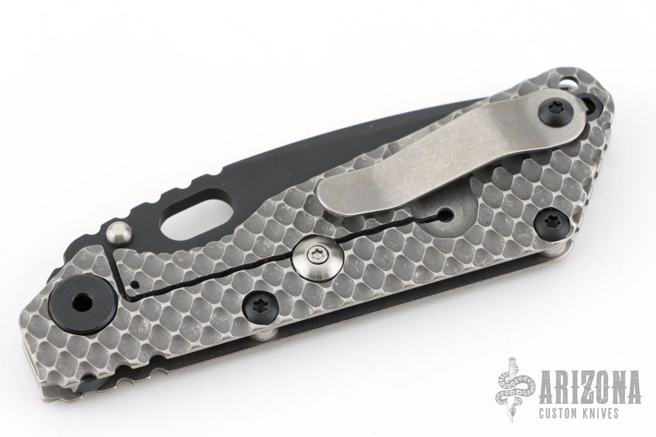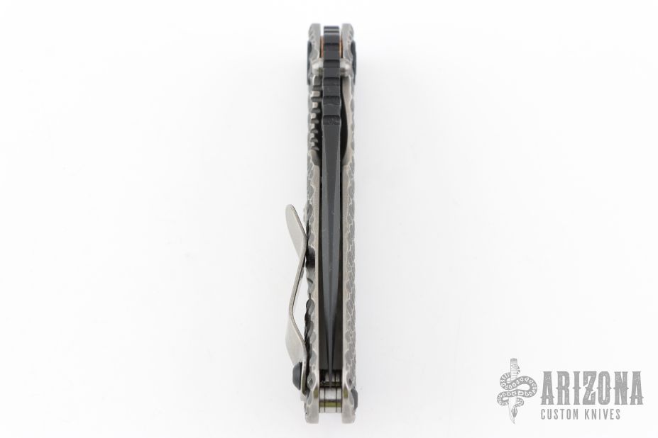 This SNG DGG by Strider has a black finished blade with dual thumb studs, thumb hole, and notched thumb rest. Handle is titanium "Gunner Grip", lockbar stabilizer, and titanium tip up clip. Nice detent, lockup and blade seating. New condition.