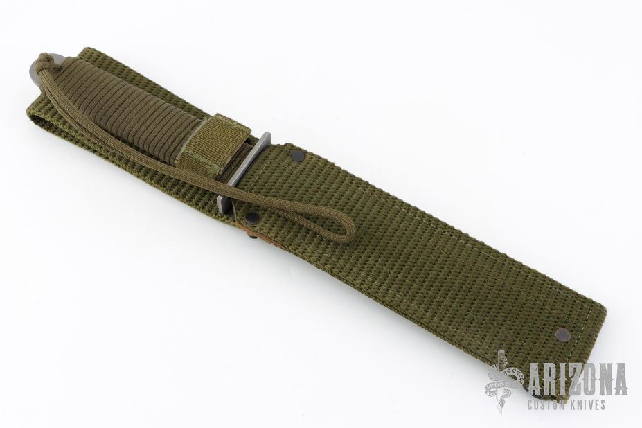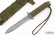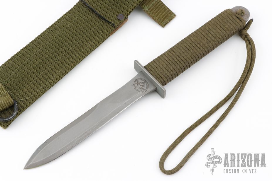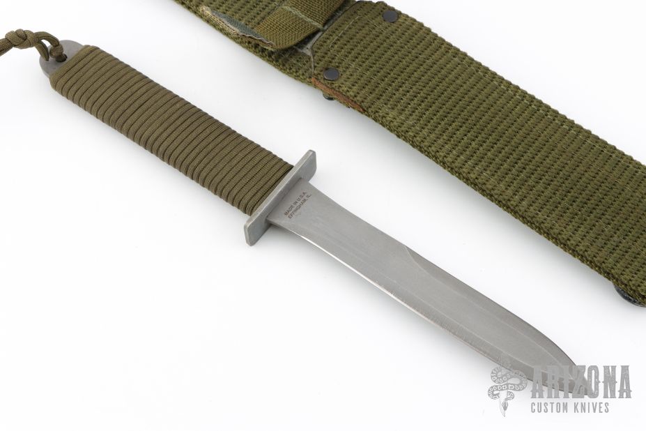 This PB-3W by EK Knives features a bead blasted blade with sharpened top edge, .147" blade stock and .985" blade depth, hidden tang construction. The handle has a blasted stainless steel guard and black paracord wrapped handle. Comes with original nylon sheath. Has some light scuffs and scratches, excellent condition otherwise.