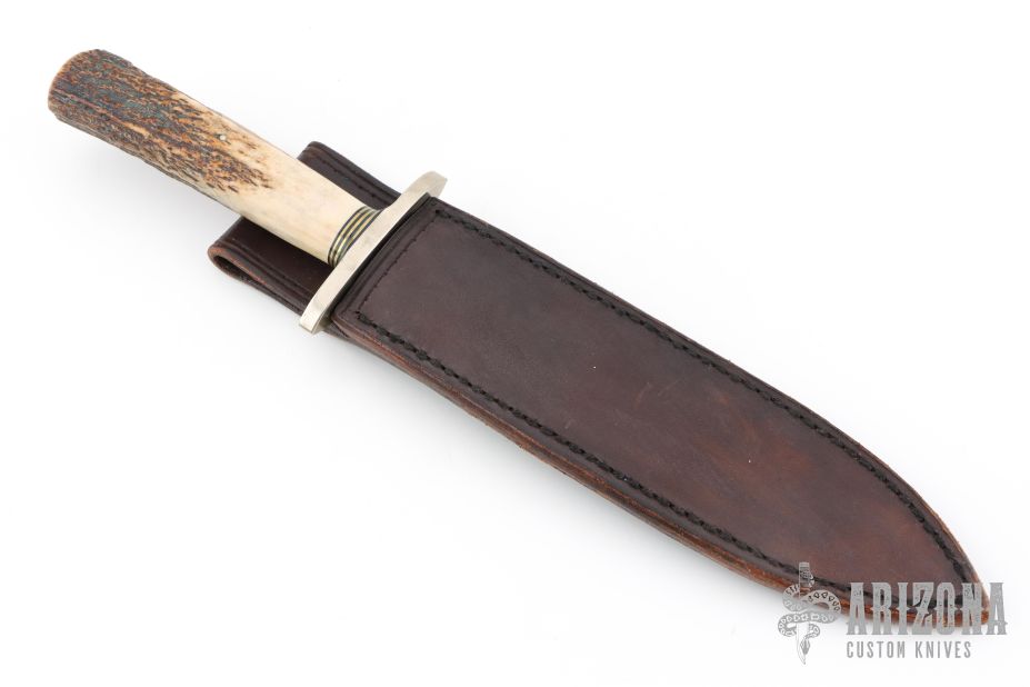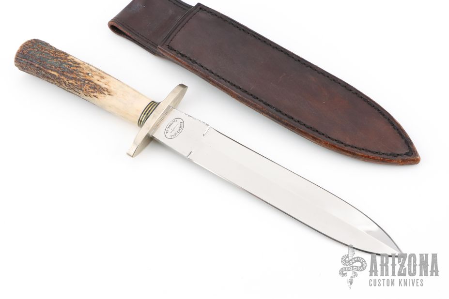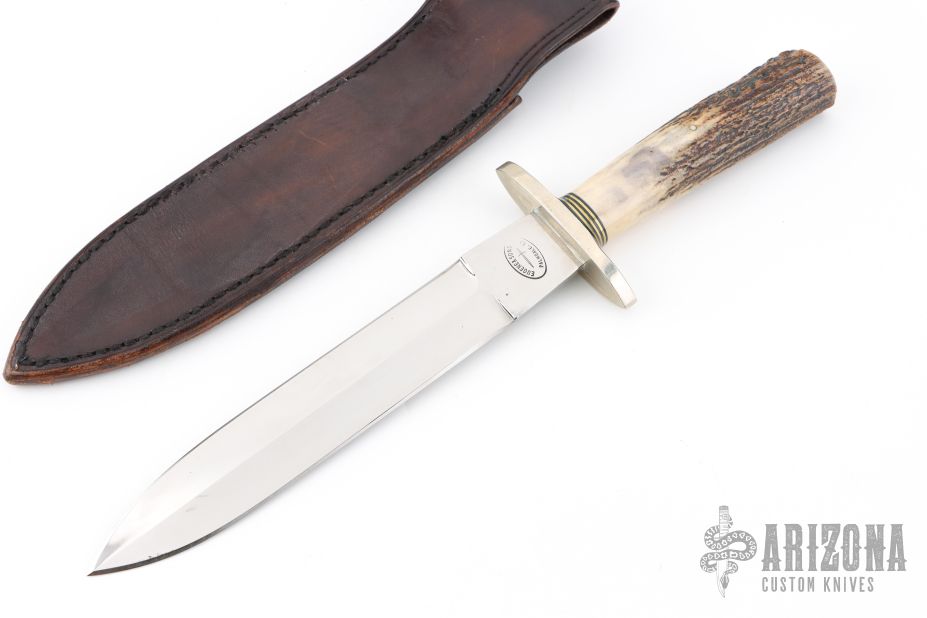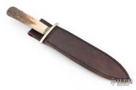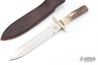 This Dagger by Eugene and Sons features a mirror polished double edged blade with .185" blade stock and 1.252" blade depth, hidden tang construction. The handle has a nickel silver guard, stag grip, black/brass spacers. Comes with a brown leather sheath. Has a few light scratches, otherwise excellent condition.