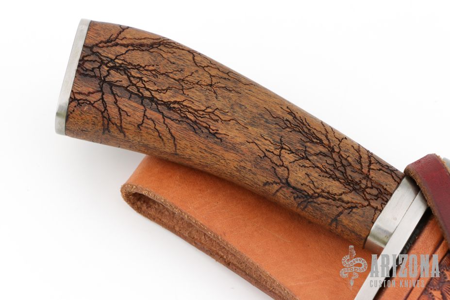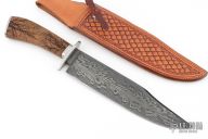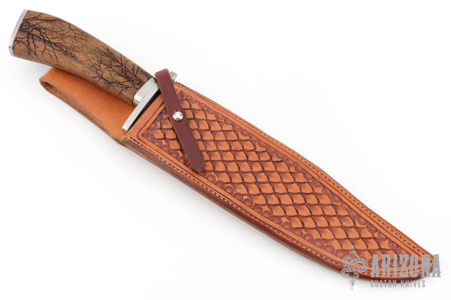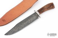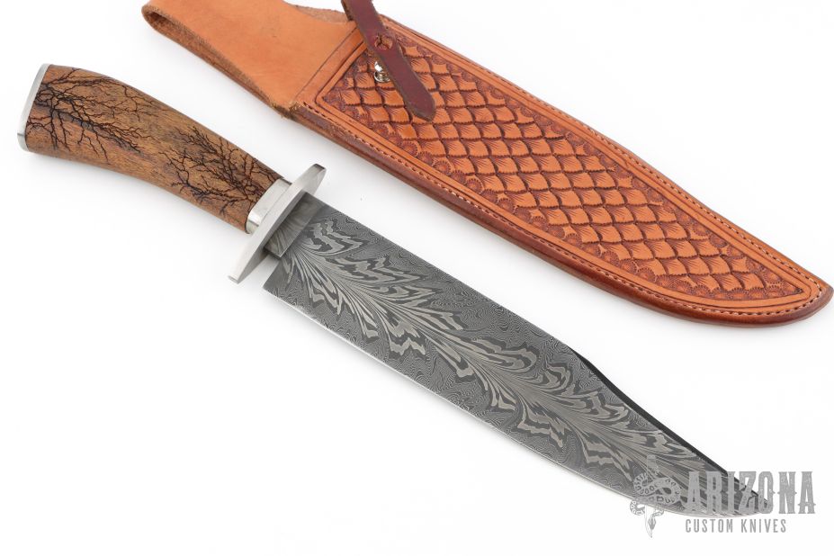 This Bowie by Bill Poor features a Feather Damascus blade with false top edge, .193" blade stock and 1.791" blade depth, hidden tang construction. The handle has a steel guard collar and butt, wood grip with lightning bolt carving. Comes with a hand tooled brown leather sheath and a zippered case. Excellent condition.