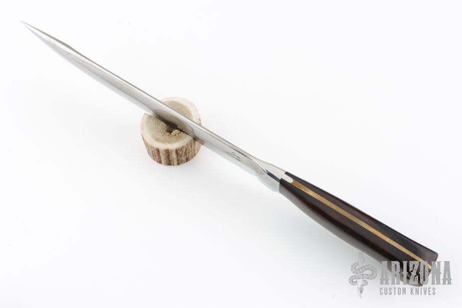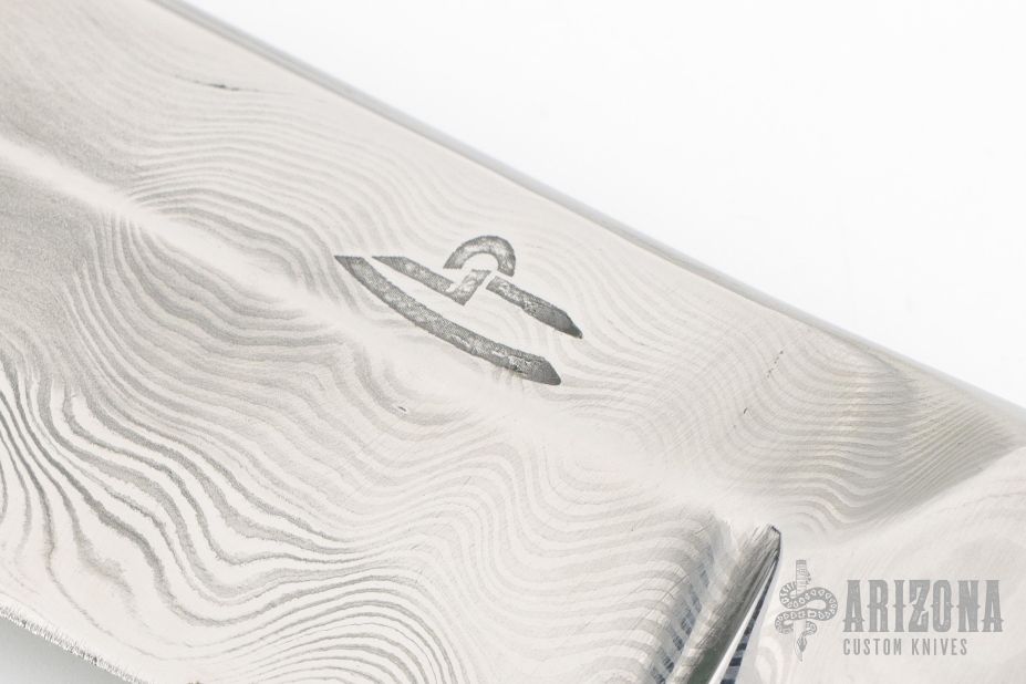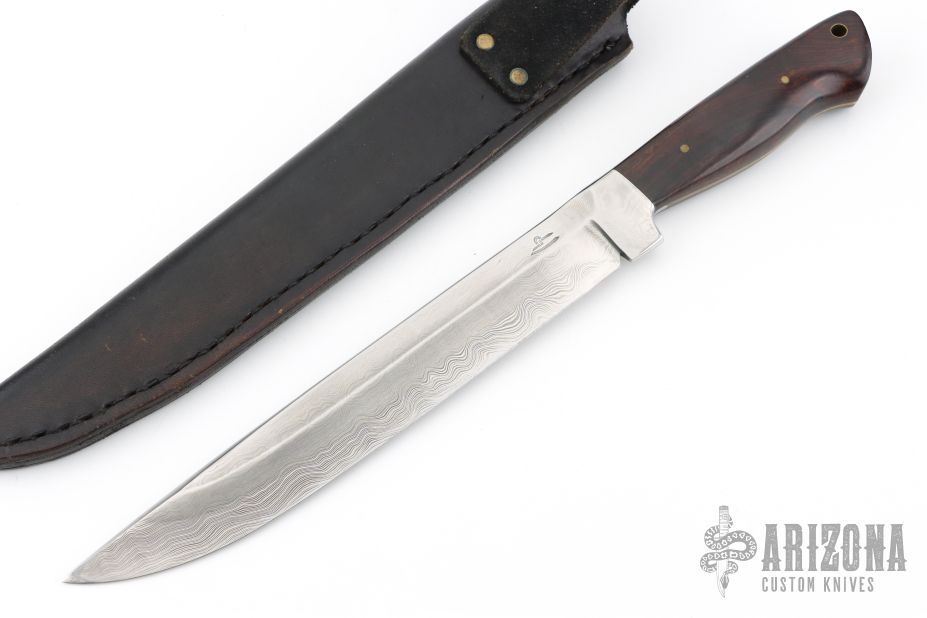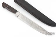 This knife features a Damascus blade with visible temper line, false top edge and integral bolsters that are dovetailed, .282" blade stock and 1.258" blade depth right infront of the bolsters, has a full tapered tang construction. The tang is brass and it starts just behind the bolsters. The handle has desert ironwood burl scales. Comes with a brown leather sheath. Has a few light scratches, otherwise excellent condition. Please let us know if you know who this maker is.