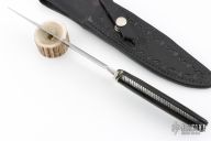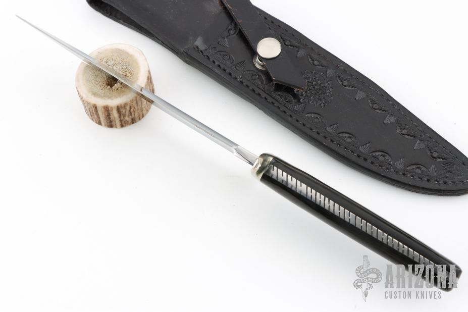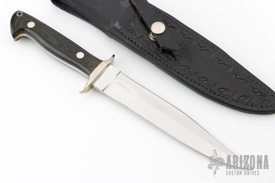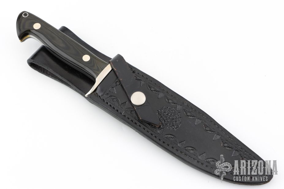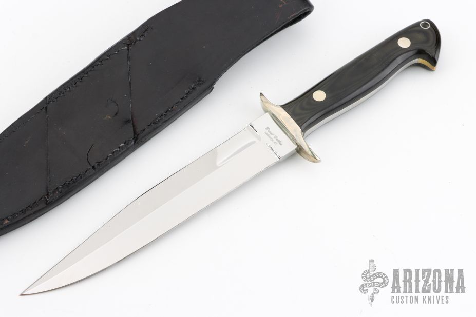 This Fighter by Daryl Hibben features a mirror polished blade with sharpened top edge, .247" blade stock and 1.220" blade depth, full tapered tang construction. The handle has a nickel silver guard, black linen micarta scales, fileworked tang. Comes with a hand tooled black leather sheath. Has a couple very light scratches otherwise excellent condition.