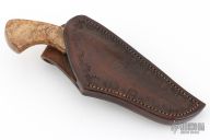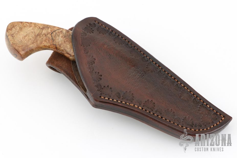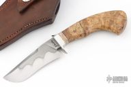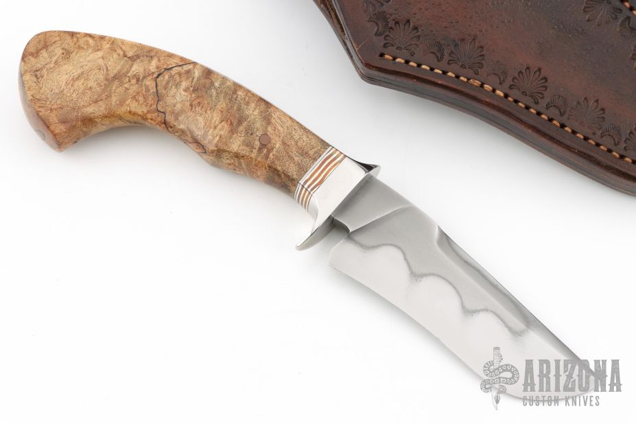 This Hunter by Josh Botelho features a hand rub satin finished flat ground blade with nice hamon, .158" blade stock and 1.224" blade depth, hidden tang construction. The handle has a stainless steel guard, spalted maple grip, mokume and stainless spacers and a single copper pin. Comes with a hand tooled brown leather sheath with belt loop. Excellent condition.