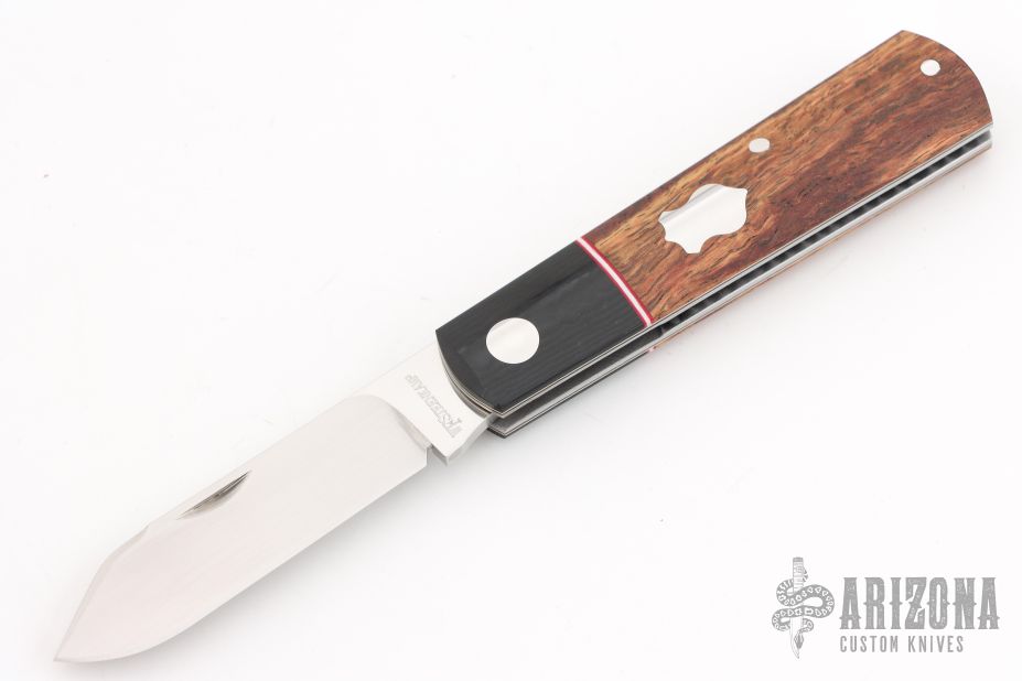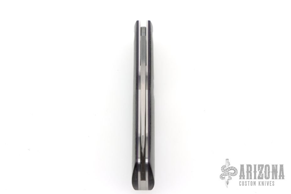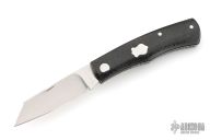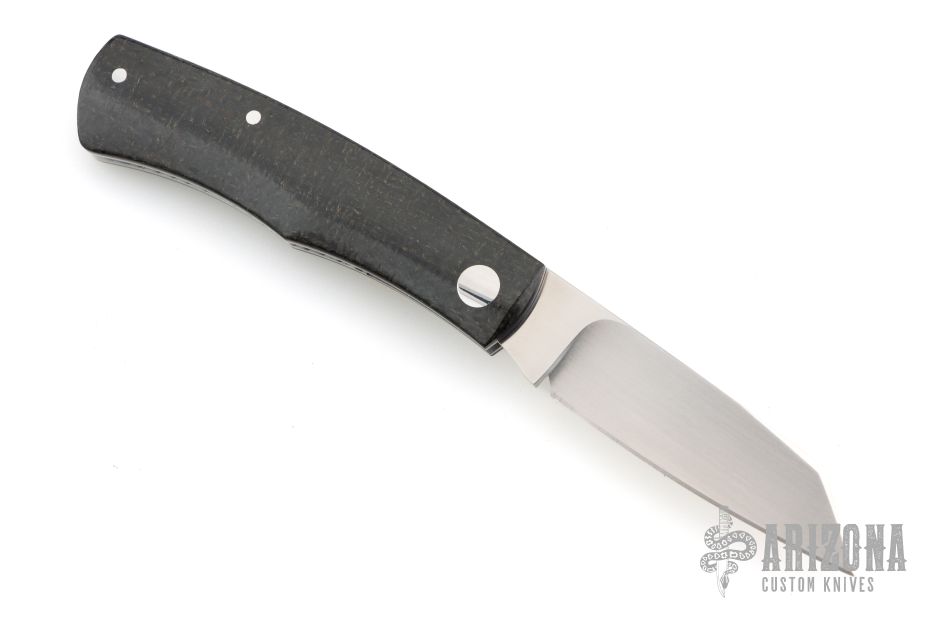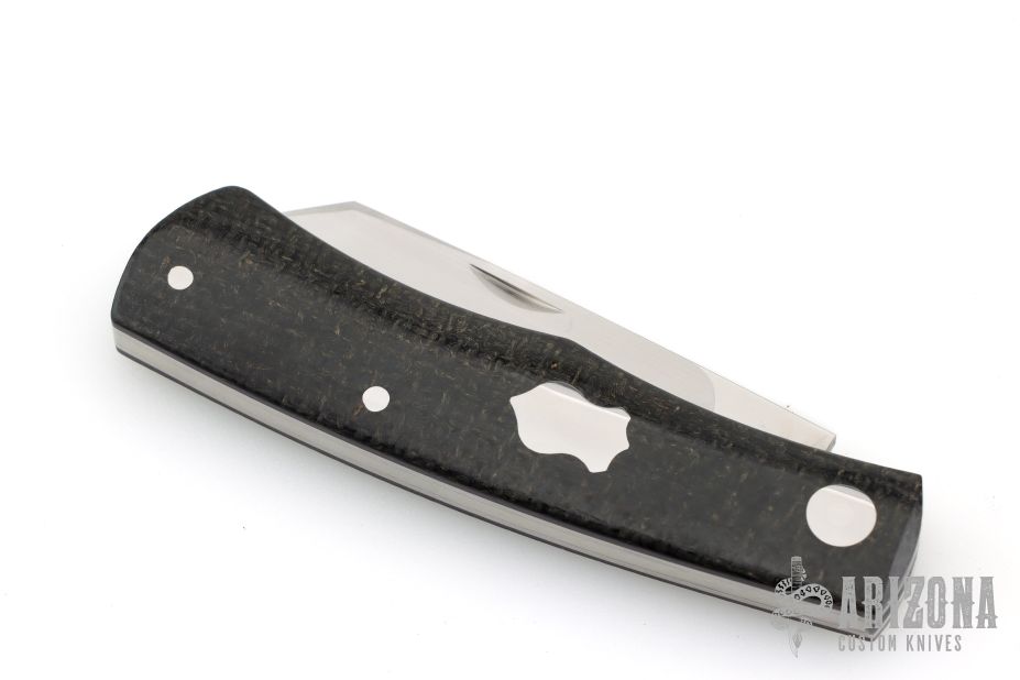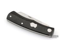 This Native by Willem Steenkamp features a hand rub satin finished blade with nail nick. The handle has black burlap micarta covers with a stainless steel escutcheon and jeweled liners, steel liners, stainless steel spring. Has half-stop, flush in all positions. Comes with maker's zipper case, leather slip, and COA dated 04/25. New from maker!