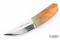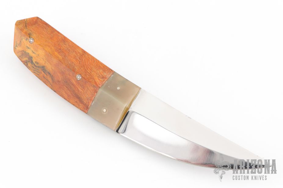 This Mini Japanese Tanto features a mirror polished blade with false top edge, .140" blade stock and 1.079" blade depth, full tang construction. The handle has honey horn bolsters and wood scales with mosaic pins. Comes with a zippered case. Excellent condition. Please let us know if you know who this maker is.
