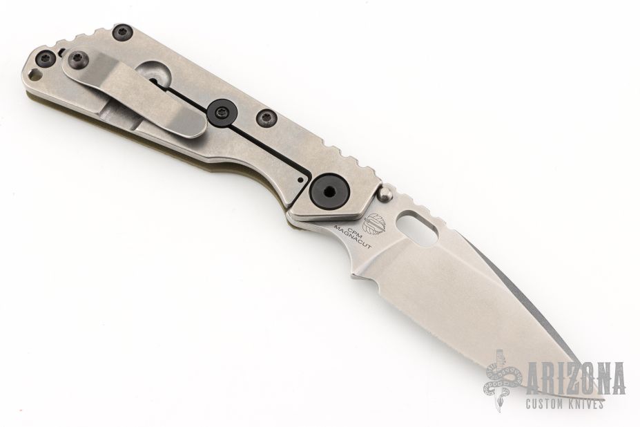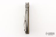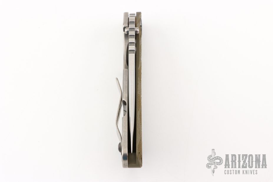 This MSC SNG framelock folder by Mick Strider features a stonewashed blade and a Crosshatch Ranger Green G-10 and stonewashed titanium frame and tip up titanium clip. Includes Hinderer "Lock Bar Stabilizer" for maximum reverse lock retention. Nice detent, lockup and blade seating. New condition.