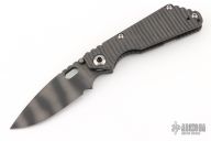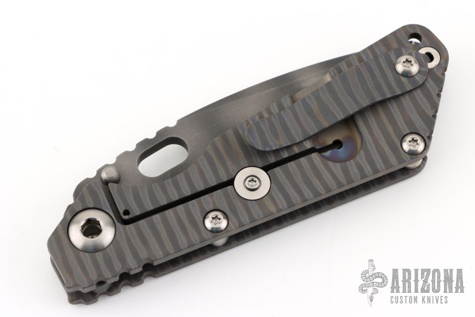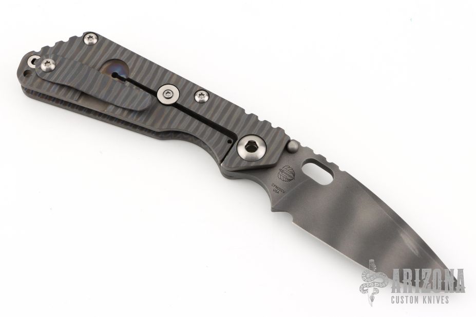 This Mick Strider Performance Series SMF framelock folder features a tiger striped drop point blade with thumbhole and notched thumbrest. The handle has a flamed titanium frame with titanium clip, tip up carry. Jimping on blade spine. Includes Hinderer "Lock Bar Stabilizer" for maximum reverse lock retention. Nice detent, lockup and blade seating. Has a scuff on the blade, otherwise excellent condition.