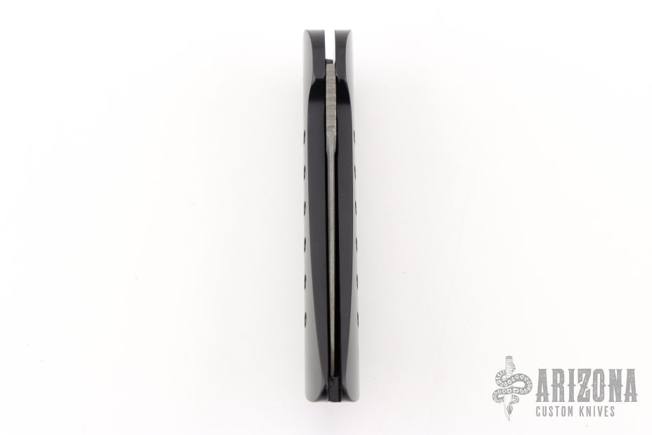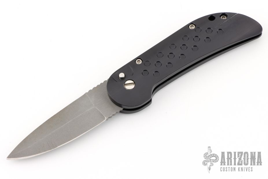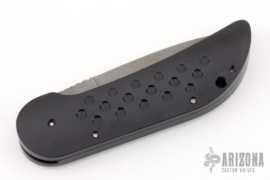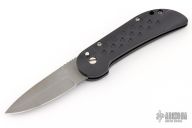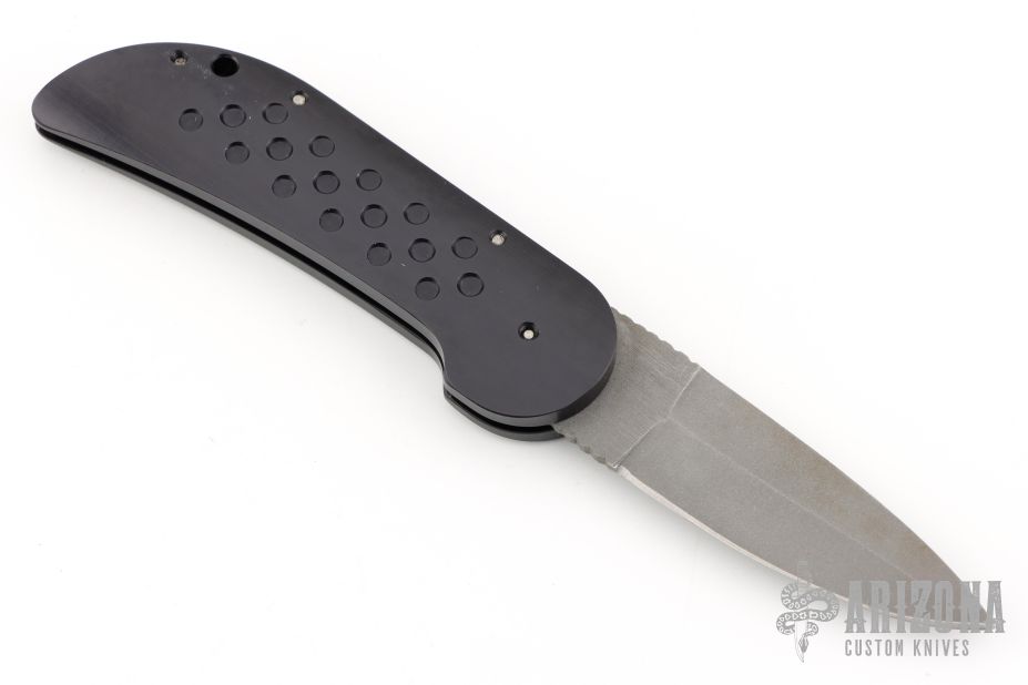 This Skinwalker by Rob Dalton features a bead blast blade with false top edge and notched thumbrest. The handle has a black anodized drilled aluminum frame. Has some minor wear on the handle finish, otherwise excellent condition.