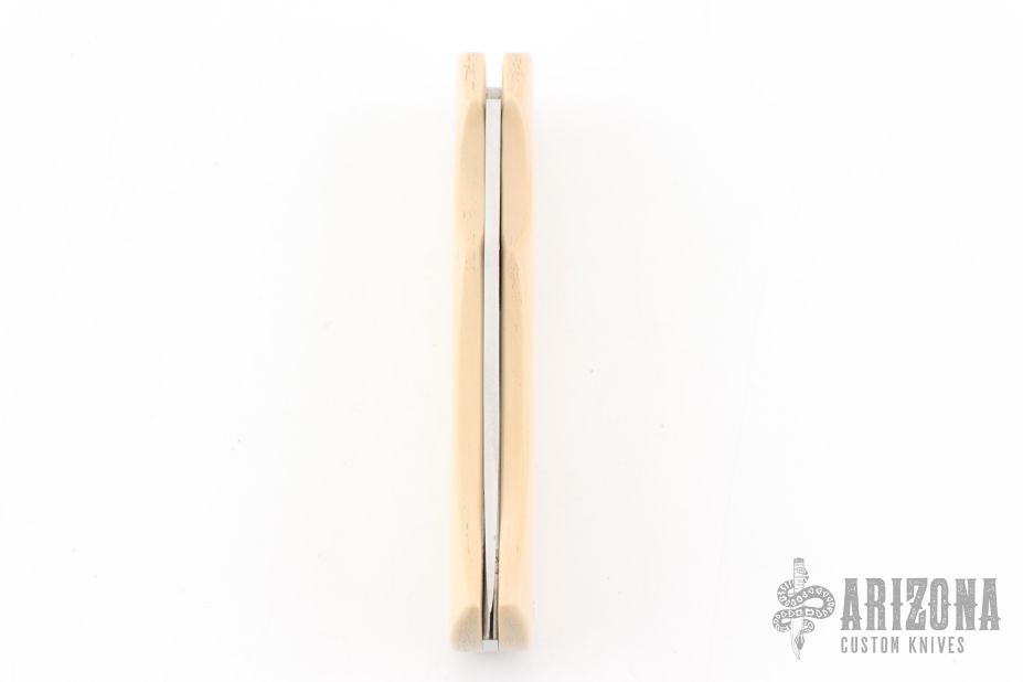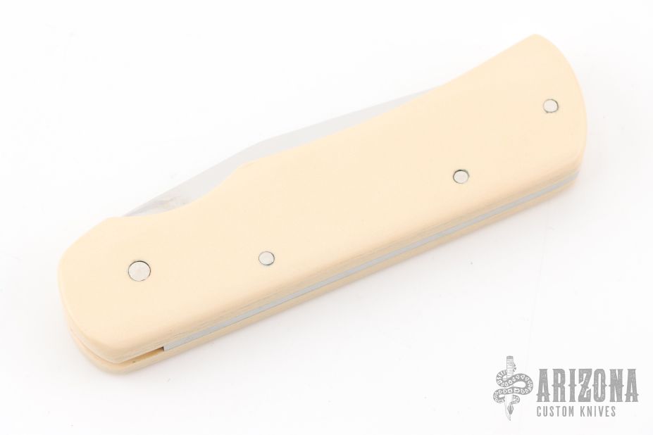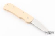 This is a side-opening coil spring automatic by J.C.S. (please let us know if you know who this maker is) with a high polish blade and ivory paper micarta handle. Nice action and blade seating. Excellent condition.