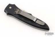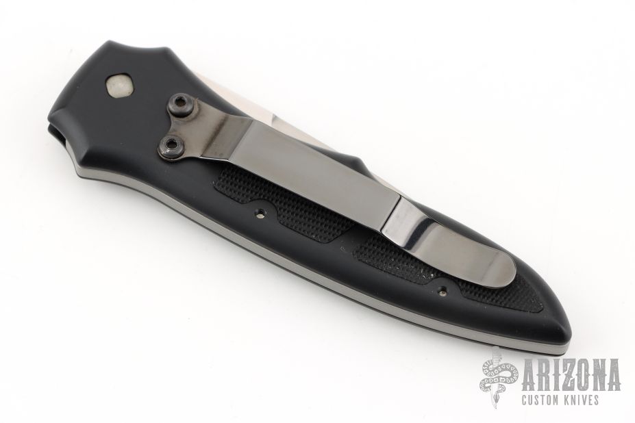 This Mini Cobra side-opening automatic is from the custom series and features a hand-ground hand rub satin blade by Harold Corby. Coil spring. Sliding safety. The handle has a black aluminum frame  with non-slip inserts, tip down black stainless steel clip. Numbered #047. Excellent condition.