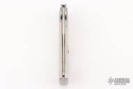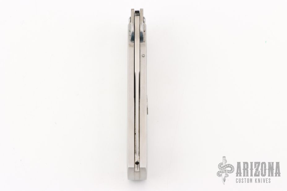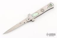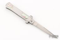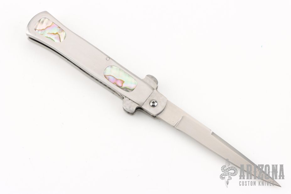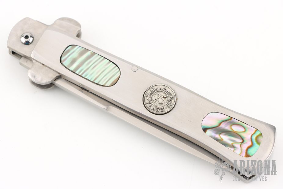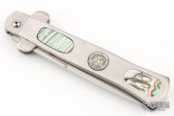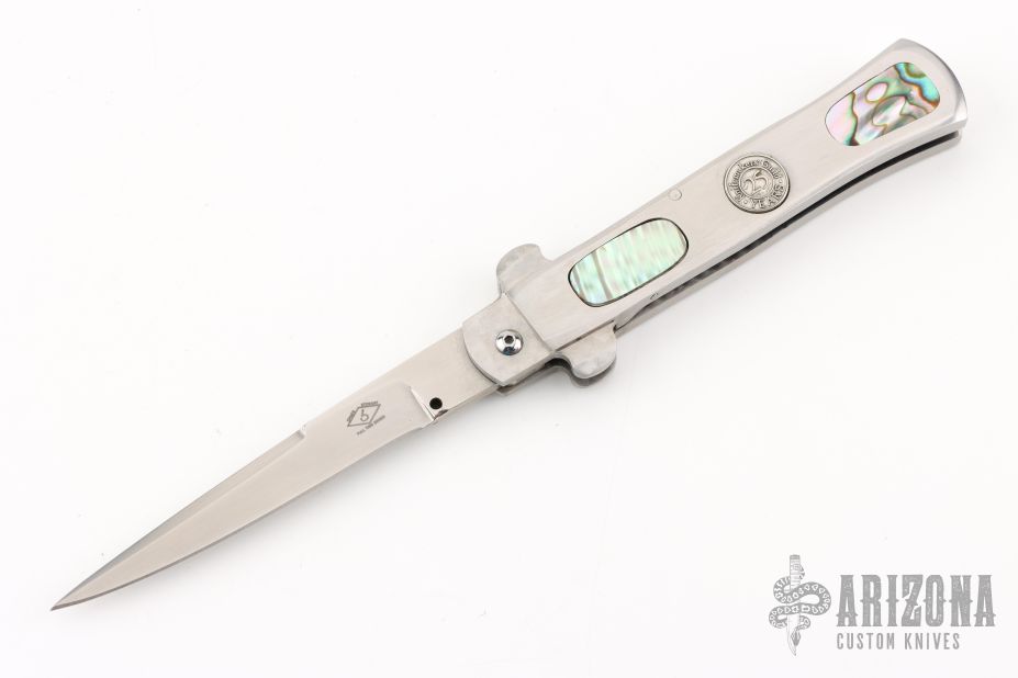This Auto by the late Chuck Stewart features a hand rub satin finished blade, this knife can be opened by pushing the hidden button that is under one of the abalone inlays. The handle is satin finished stainless steel with abalone inlays. Has scratches, otherwise good condition.