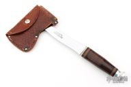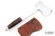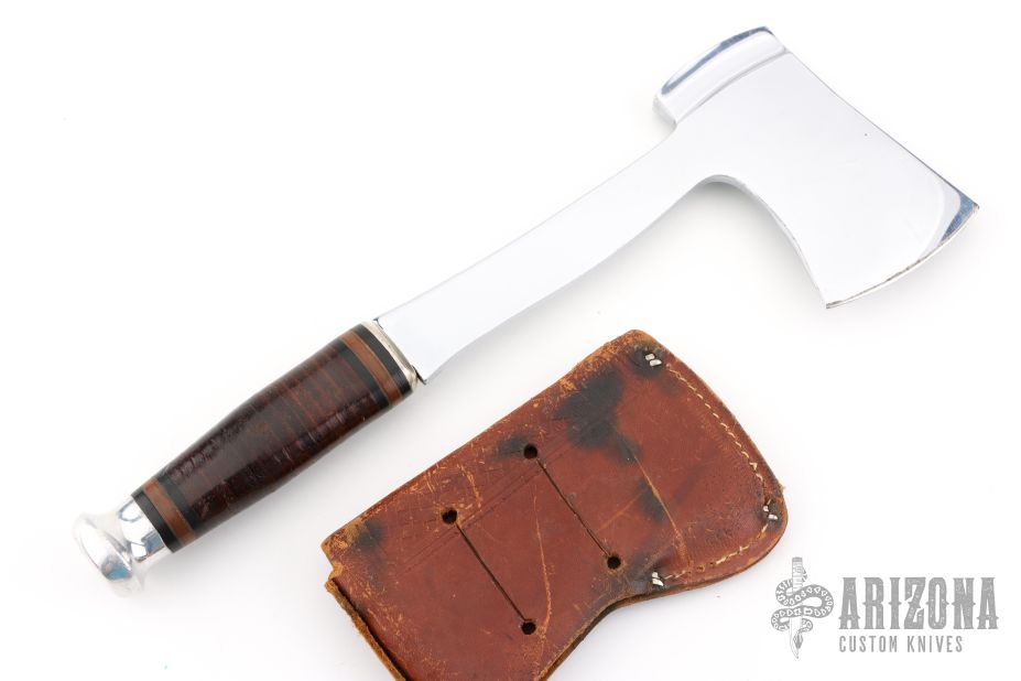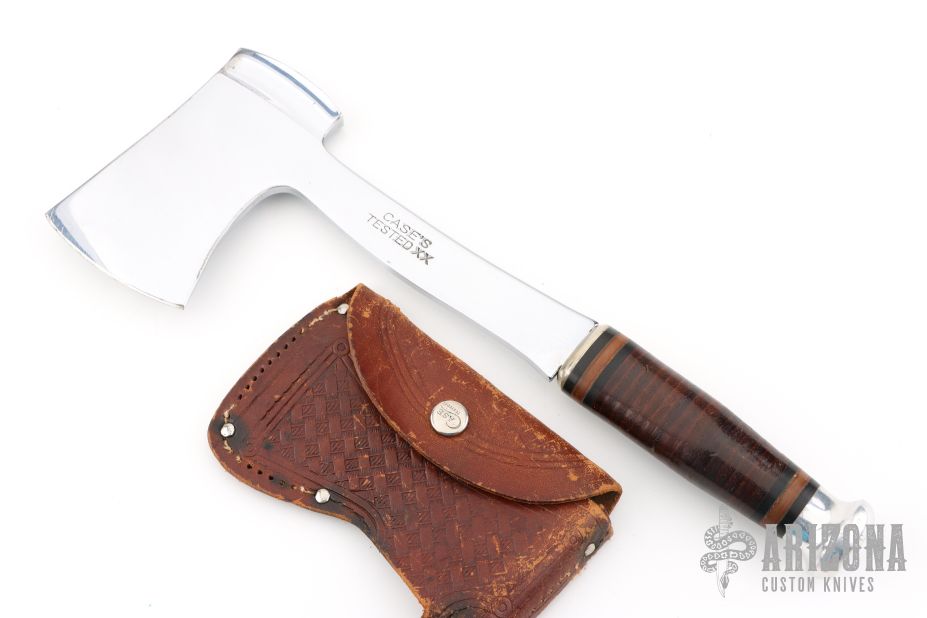 Case's Tested XX Hatchet. This one has a mirror polished blade and tang with a hammer poll, .175" blade stock, full tang construction with a stacked leather grip with aluminum pommel. The hammer poll is interesting because it is thicker than the blade stock and hollow ground transition from the blade, hopefully you can see what I mean in the pictures. Comes with original brown leather sheath. Nice vintage piece from Case Knives. Has some patina and scratches. Great condition for its age.