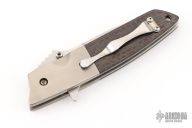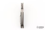 This knife by Dale Reif features a hand rub satin finished blade with notched thumbrest, dual thumbstuds and flipper tab. The handle has titanium bolsters, carbon fiber scales, titanium liners, and knurled spacers. Has some lockrock. Marked "2" on the blade. Has some scratches, good condition otherwise.