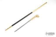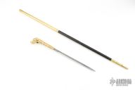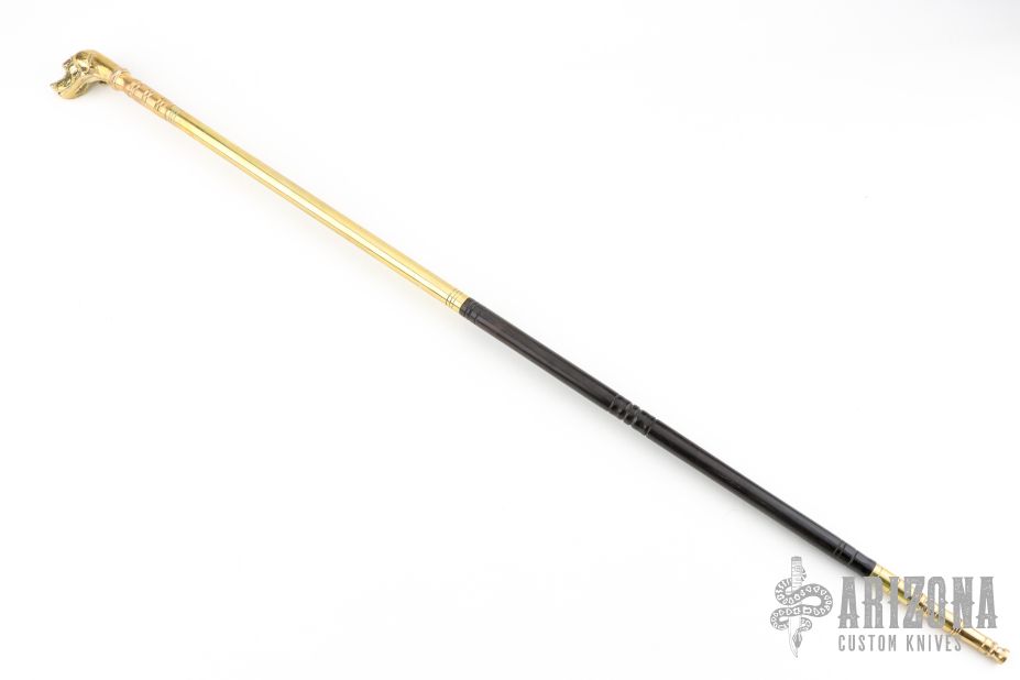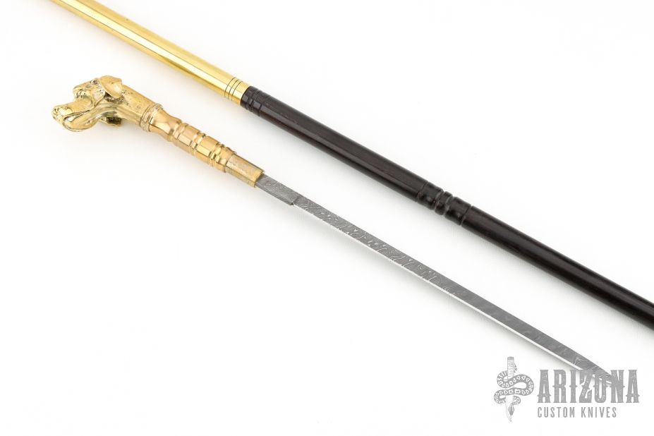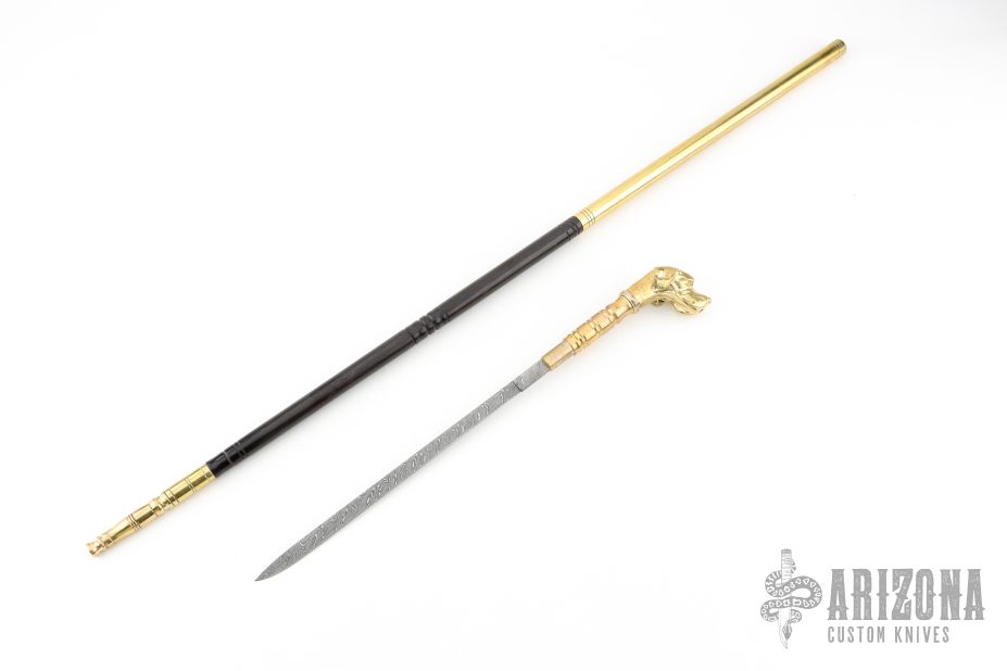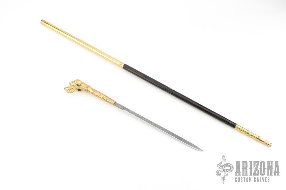 This sword cane by Armenian Doctor Knives features a Zladinox Damascus blade with .151" blade stock and .434" blade depth, hidden tang construction. The handle of the sword and cane is cast and carved bronze. The length of the knife portion of the cane is 10.5" blade and 16" overall, the cane in total is 35" overall. The cane is bronze and ebony wood. New from maker!