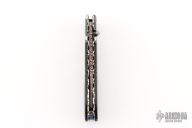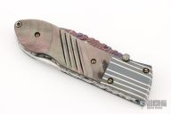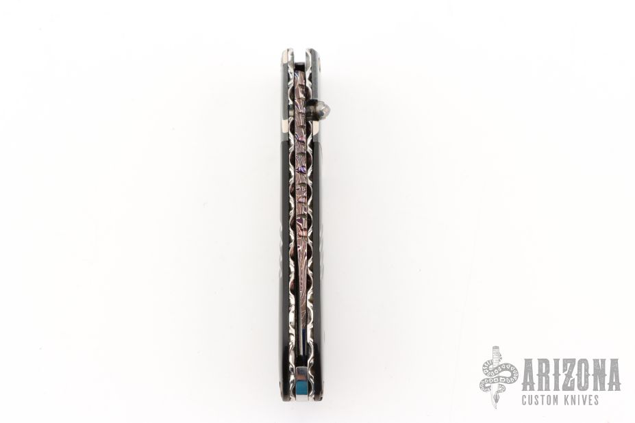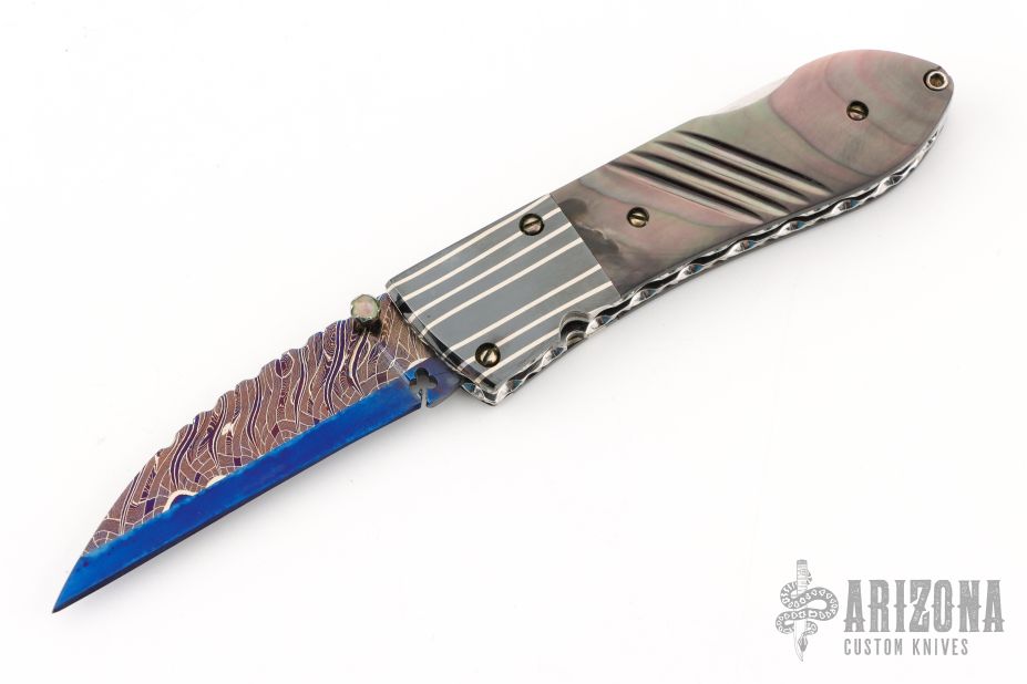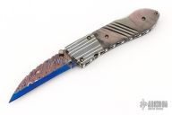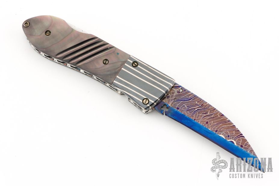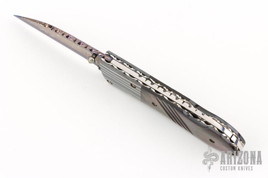 This Lockback by Peter Martin features a blued multi-bar Mosaic Damascus blade with single thumbstud, opal inset, and fileworked blade spine. The handle is comprised of blued Mosaic Damascus bolsters, fluted pearl scales, fileworked and anodized titanium liners and a fileworked and polished backspacer. Has a couple light scratches, otherwise Excellent condition.