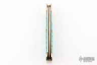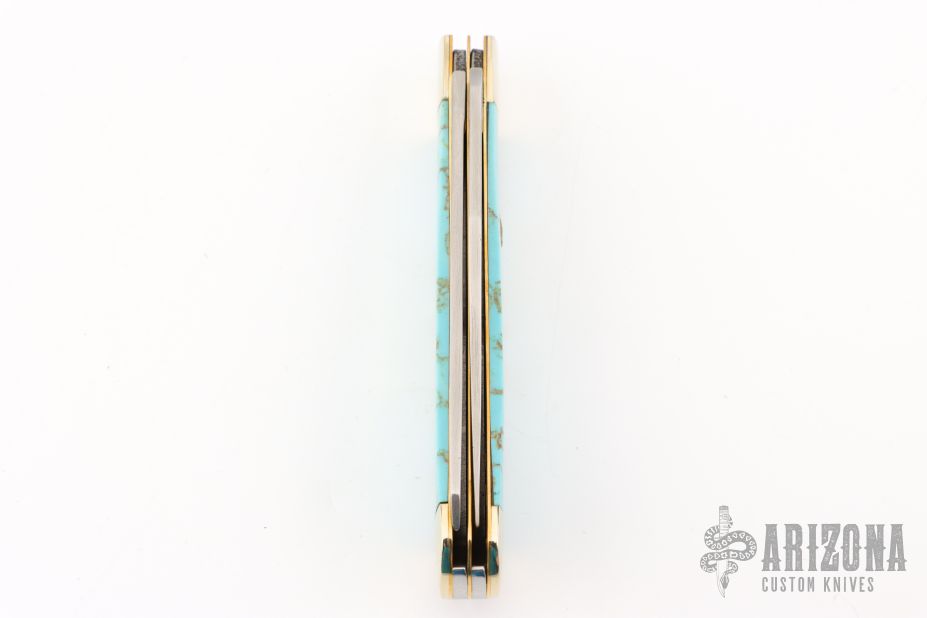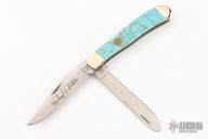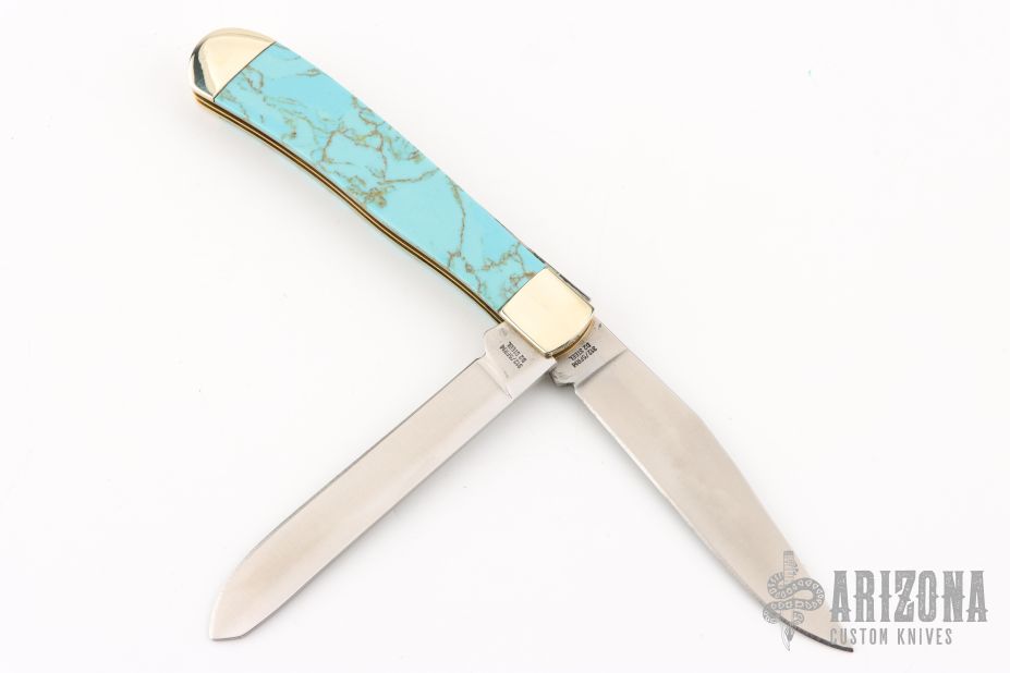 This knife by Hen and Rooster was customized by Michael Prater of Painted Pony Designs. It features two satin finished blades with nail nicks. The handle has nickel silver bolsters, custom turquoise covers by Michael Prater, brass liners and stainless steel springs. Has a few light scratches, otherwise excellent condition.  Comes with original box and COA.