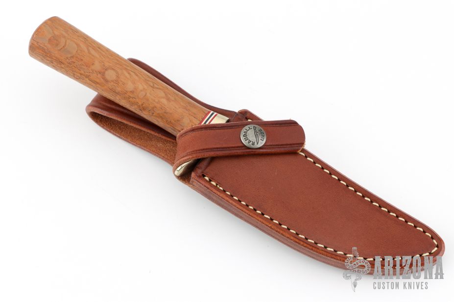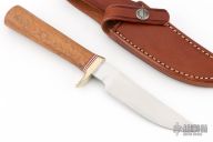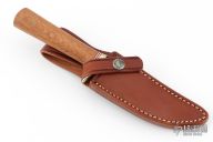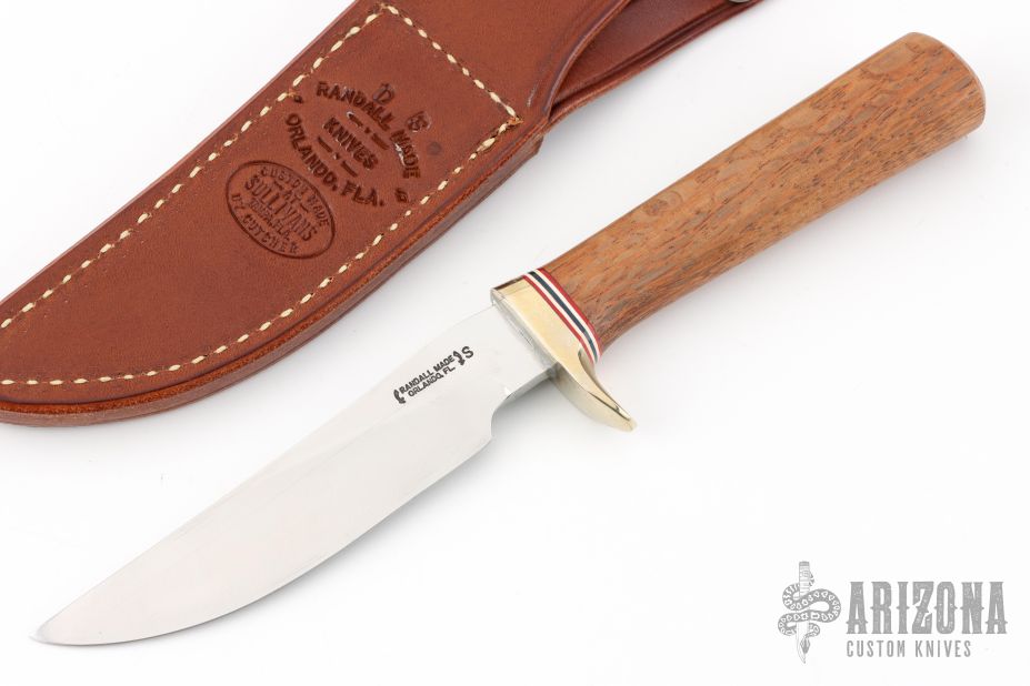 This Model 7-4.5 from Randall Made Knives features a satin finish clip point blade with .163" blade stock and .968" blade depth, hidden tang construction. The handle has a nickel silver guard, lacewood grip with red/white/blue spacers. Comes with brown leather sheath. Excellent condition.