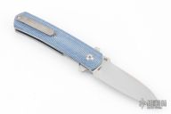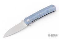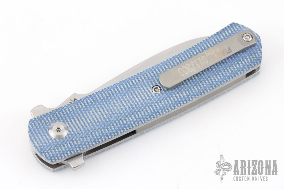 This linerlock flipper is a collaboration between Max Knives and Stephane Espi. It is a limited first run of 300 pieces. It features a stonewashed blade with flipper. The handle has blue canvas micarta scales, stonewashed stainless steel liners and a blasted titanium backspacer with lanyard pin, tip up titanium clip. Clip reads "First Run 011/300. Comes with a Velcro case. New from maker at the 2025 Blade Show.