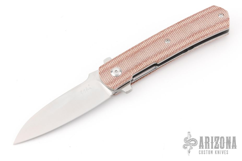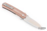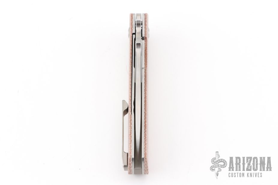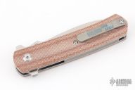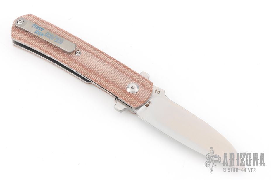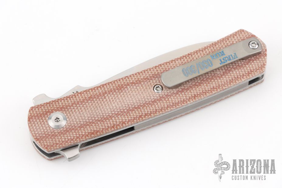 This linerlock flipper is a collaboration between Max Knives and Stephane Espi. It is a limited first run of 300 pieces. It features a stonewashed blade with flipper. The handle has natural canvas micarta scales, stonewashed stainless steel liners and a blasted titanium backspacer with lanyard pin, tip up titanium clip. Clip reads "First Run 030/300. Comes with a Velcro case. New from maker at the 2025 Blade Show.