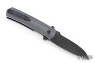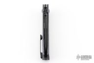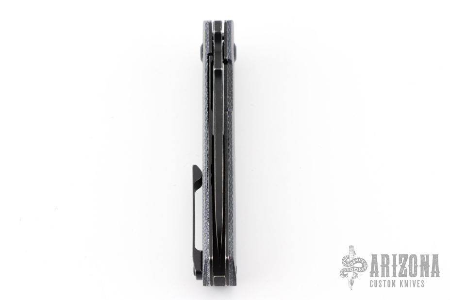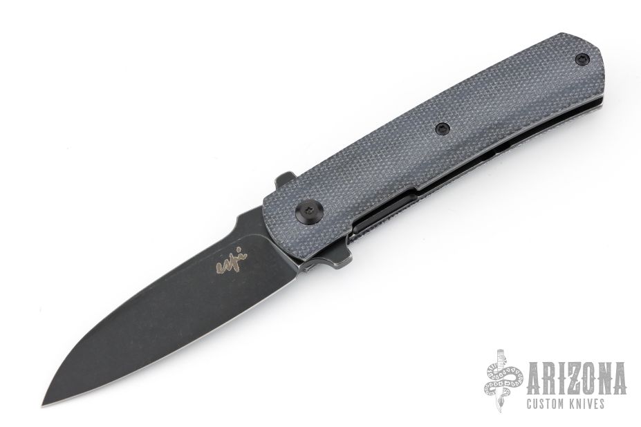 This linerlock flipper is a collaboration between Max Knives and Stephane Espi. It is a limited first run of 300 pieces. It features a black blade with flipper. The handle has black canvas micarta scales, stonewashed stainless steel liners and a black titanium backspacer with lanyard pin, tip up titanium clip. Clip reads "First Run 004/300. Comes with a Velcro case. New from maker at the 2025 Blade Show.
