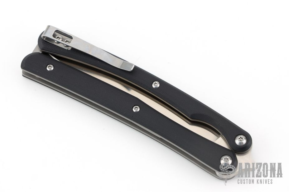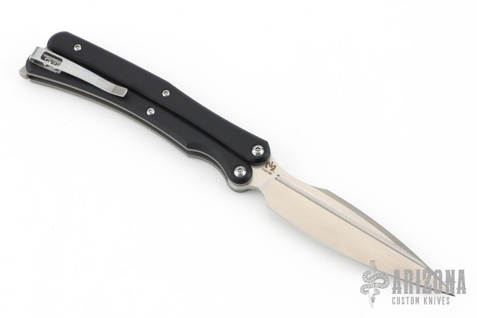 This BaliTac by Max Knives is a Grind Tactical Deisgn. It features a satin finished blade with fullers. The handles have Black G-10 scales, bead blasted titanium liners and T-latch, tip up stainless steel clip. Comes with velcro case and COA #113/150. New from maker.