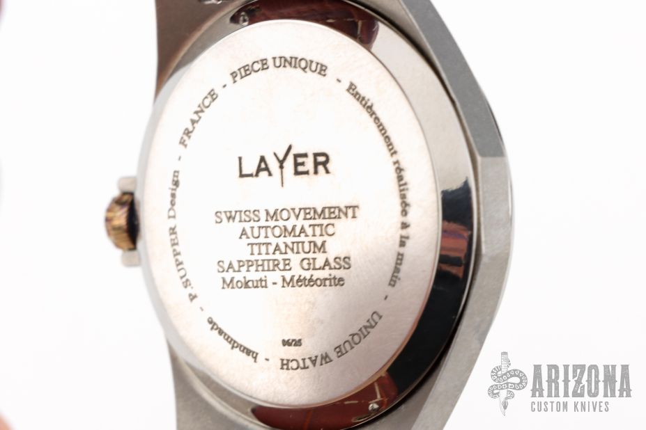 This Watch by Layer Watches has a polished titanium bezel and stonewashed case, Meteorite Dial, sapphire glass, mokuti crown. This one is one of a kind. 46mm case. Swiss Automatic Movement. Comes with a watch case and COA. New from maker at the 2025 Blade Show. One of a kind.