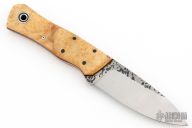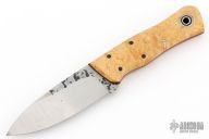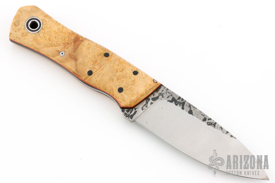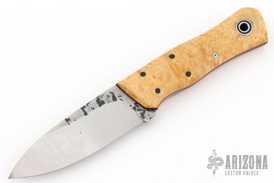 This Monarch by Fiddleback Forge features a drop point A2 blade, .121" blade stock and 1.184" blade depth, full tapered tang construction. The handle has maple burl covers, orange/black G-10 liners, black micarta pins and a lanyard tube. Has a couple light spots on the blade, excellent condition.