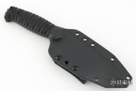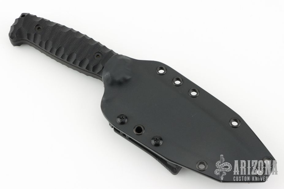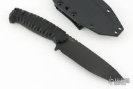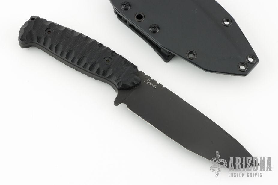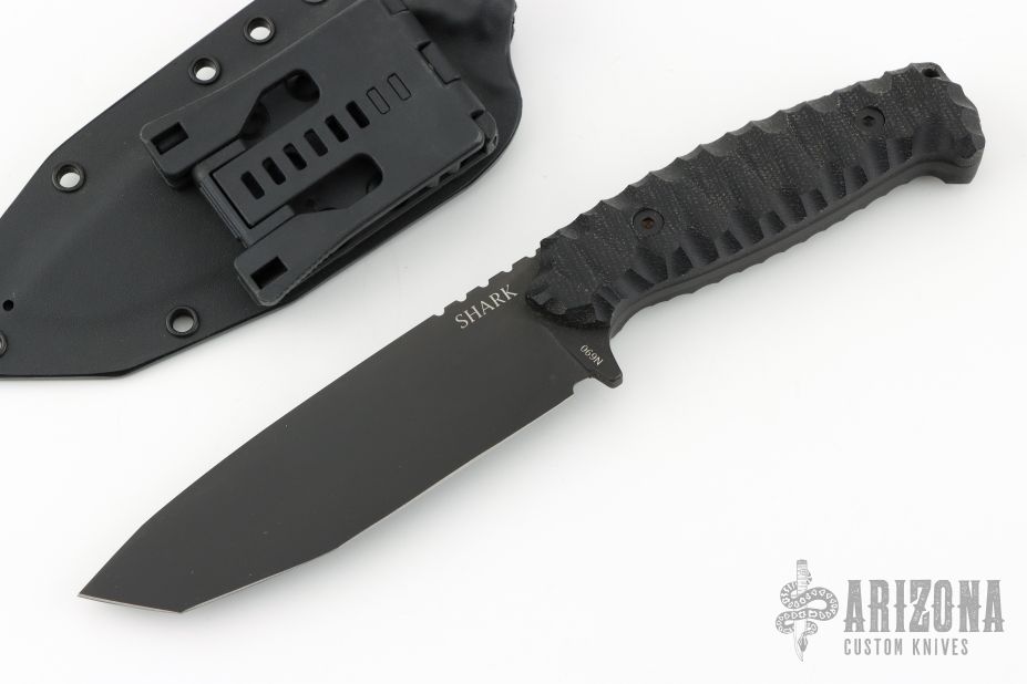 This Shark by Dachs Knives features a black DLC coated blade with notched thumbrest, .180" blade stock and 1.541" blade depth, full tang construction. The handle has black G-10 scales. Comes with a Kydex sheath with belt clip. New from maker at the 2025 Blade Show.