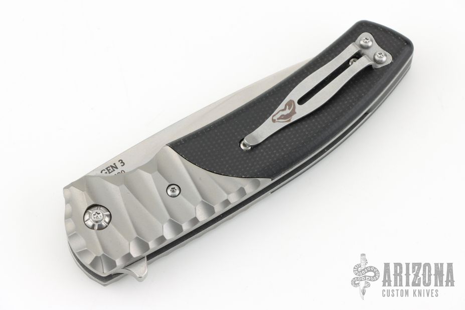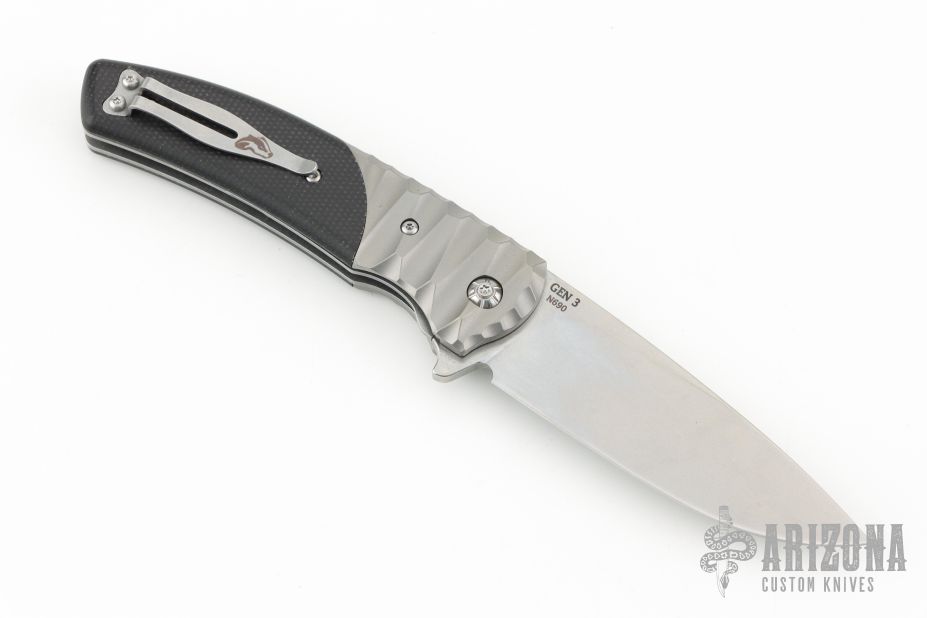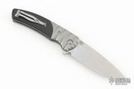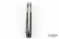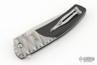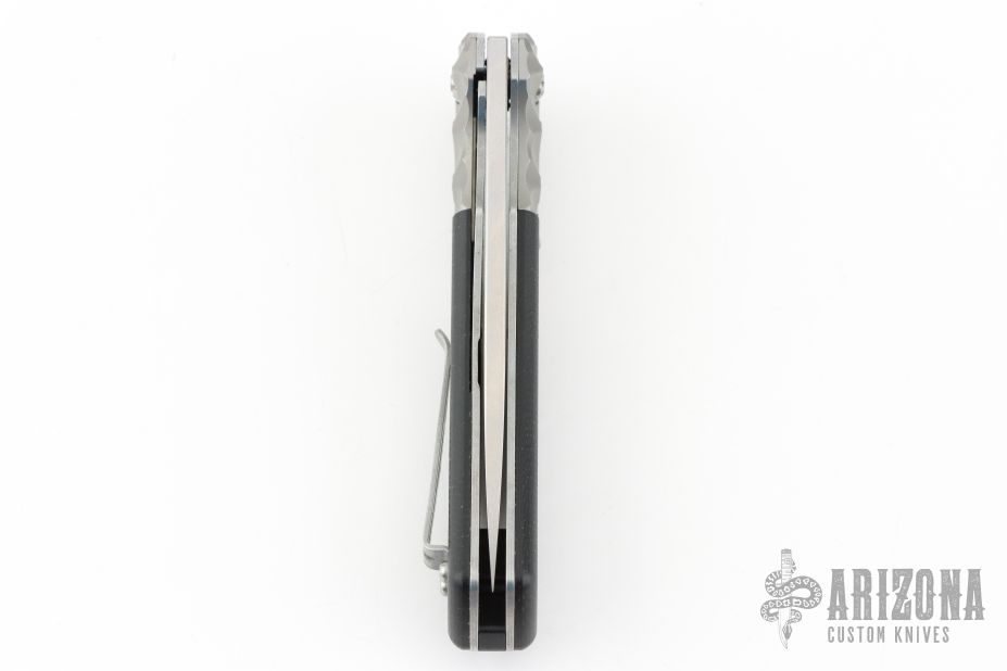 This Gentleman 3 Linerlock Flipper by Dachs Knives features a stonewashed blade with flipper. The handle has blasted titanium bolsters, black canvas micarta scales, blasted stainless steel liners, tip up stainless steel clip. Rides on bearings, nice detent, lockup and blade seating. New from maker at the 2025 Blade Show.