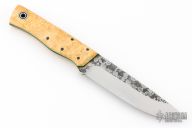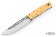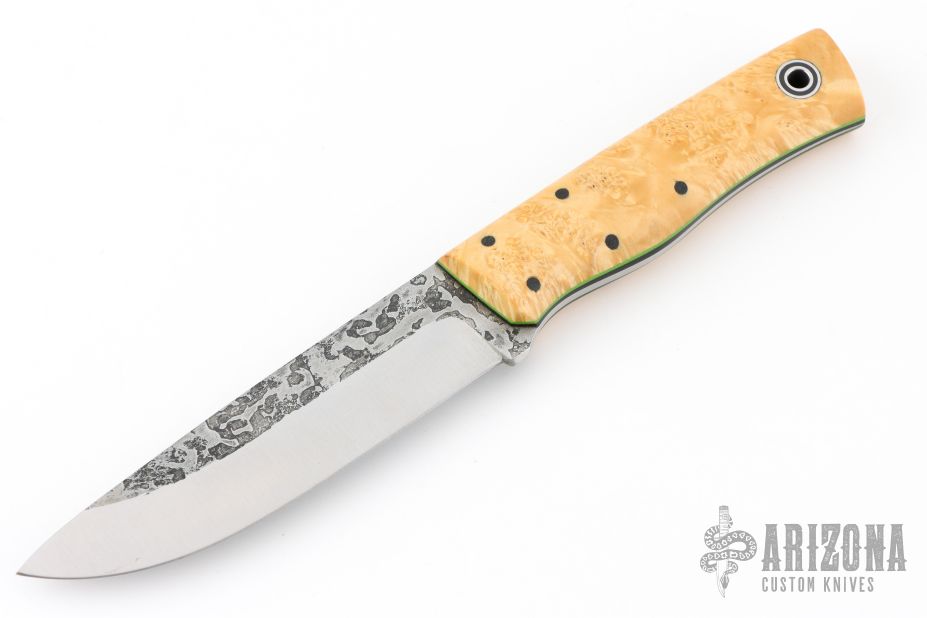 This Leuku by Fiddleback Forge features a drop point A2 blade, .162" blade stock and 1.203" blade depth, full tapered tang construction. The handle has maple burl covers, black/green G-10 liners, black micarta pins and a lanyard tube. Has a couple light spots on the blade, Excellent condition.