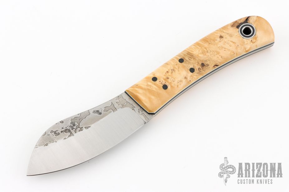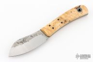 This Minimuk by Fiddleback Forge features a drop point A2 blade, .126" blade stock and 1.253" blade depth, full tang construction. The handle has maple burl covers, black/white G-10 liners, black micarta pins and a lanyard tube. Has a couple light spots on the blade, Excellent condition.
