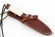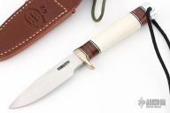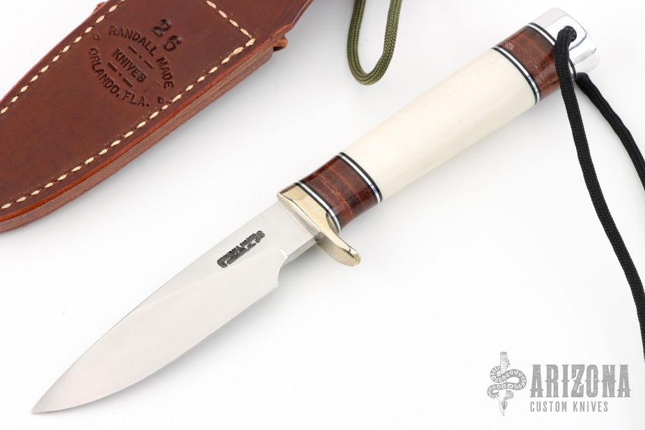 This Model 26 Pathfinder by Randall Made Knives is one of Randall's best-selling models. It features a drop point satin finished blade with notched thumbrest, .167" blade stock and .943" blade depth, hidden tang construction. The handle has a brass guard and duralumin butt with lanyard hole, white linen micarta grip and black/duralumin/leather spacers. Comes with a brown leather sheath. Excellent condition.