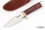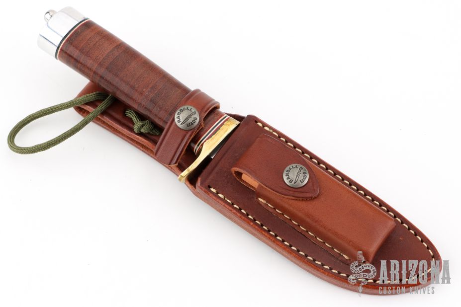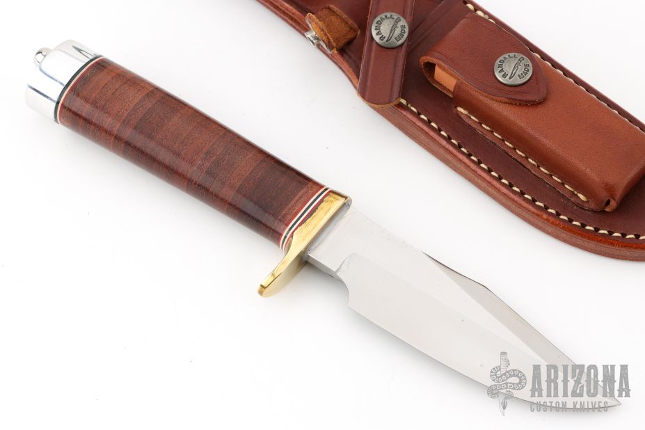 This Model 23 "Gamemaster" by Randall Made Knives features a satin finished clip point blade with sharpened top edge and a notched thumbrest, .203" blade stock and 1.297" blade depth hidden tang construction. The handle has a brass guard and duralumin butt with a stacked leather grip with red/white/blue spacers. Comes with original brown leather sheath. Excellent condition.