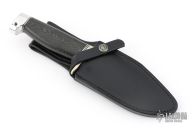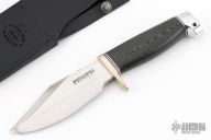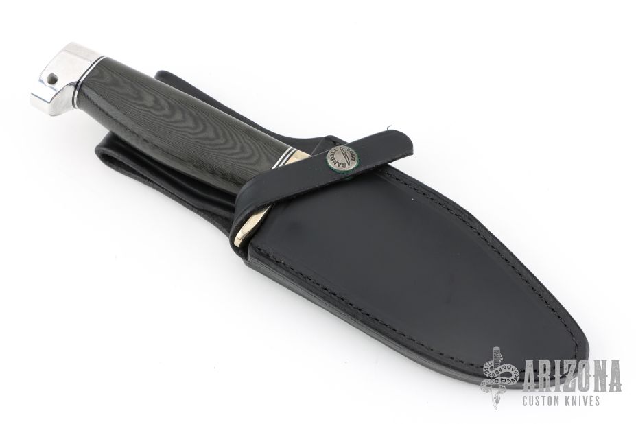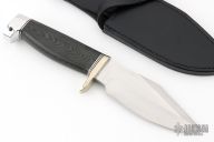 This knife has a satin finished stainless steel blade, with sharpened top edge and notched thumbrest, .242" blade stock and 1.681" depth, hidden tang construction. The handle has nickel silver guard, black linen micarta grip, black/duralumin spacers, duralumin butt with lanyard hole. Comes with a black leather sheath. Has been resharpened, has some light scraches, otherwise good condition.