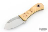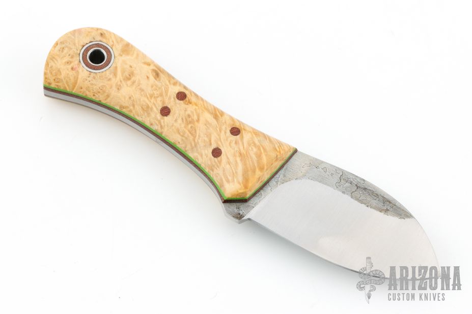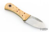 This Stubymuk by Fiddleback Forge features a drop point A2 blade, .126" blade stock and 1.169" blade depth, full tang construction. The handle has maple burl covers, brown micarta/green g10 liners, brown micarta pins and a lanyard tube. Excellent condition.