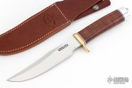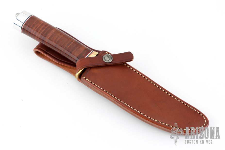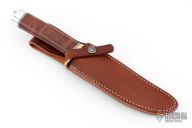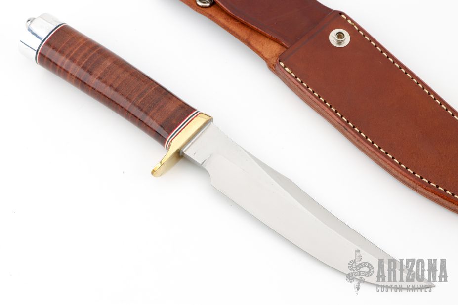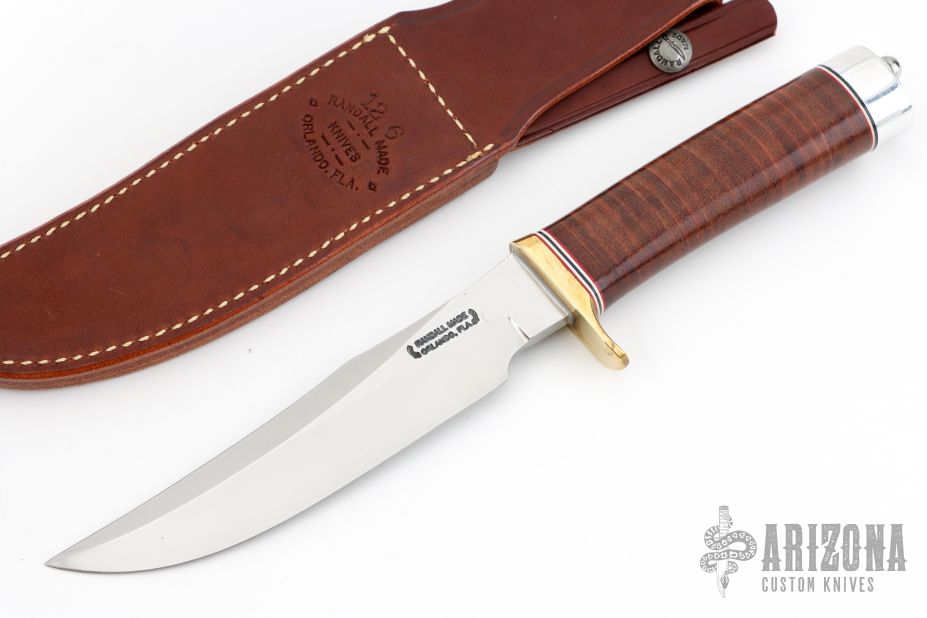 This Model 12-6 Little Bear Bowie from Randall Made Knives features a satin finished blade with a sharpened top edge and notched thumbrest, .212" blade stock and 1.213" blade depth, hidden tang construction. The handle has a brass guard and duralumin butt, stacked leather grip, red/white/blue spacers. Comes with a brown leather sheath. Excellent condition.