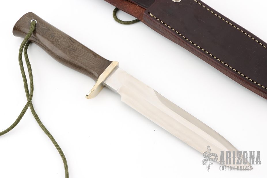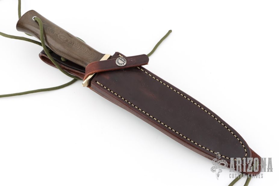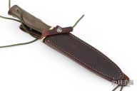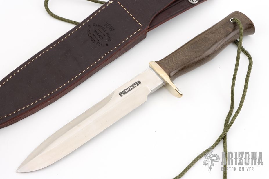 This Model 16 Diver from Randall Made Knives has a satin finished stainless steel spear point blade with sharpened top edge and notched thumbrest, .236" blade stock and 1.216" blade depth, full tang construction. Handle has a nickel silver guard, green linen micarta border patrol handle with lanyard hole. Comes with waxed brown leather sheath and original paper wrapping. Excellent condition.