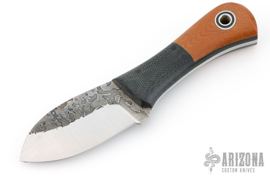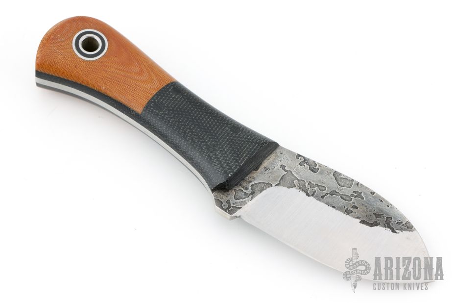 Hi, I am Andy Roy, the maker at Fiddleback Forge, LLC. I started making knives in 2007, and went full time May 1, 2009 when I got laid off of my last engineering position. I consider myself a toolmaker, and much of the focus of my work is in the handle. I strive to make the most comfortable handle you?ve ever held. It is important to me that you can hold the knife in many positions comfortably and do hard extended work with the blade. I also think it is important for the handle to index the knife in your hand, so that no matter how you hold it, you know where the edge is without having to look. I use a variety of steels, and my favorite grinds are convex, and Scandi. In 2010 I spent a lot of time developing a finish treatment for the flats of my knives that I call 3D Spalted Steel. It adds a unique character to my blades, and I think it complements the refined handle work well. I am very excited to be working with Arizona Custom Knives, and hope you enjoy the Fiddleback Forge knife you buy from them.