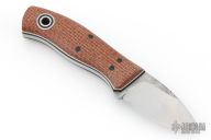 This Runt by Fiddleback Forge features a drop point blade, spalted flats, satin bevels, .157" blade stock and .905" blade depth, full tang construction. The handle has burlap micarta scales, white/black g10 liners, black micarta pins and lanyard hole. Has a couple spots on the blade otherwise, Excellent condition.