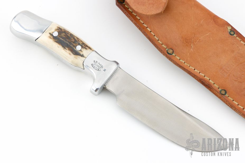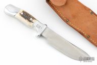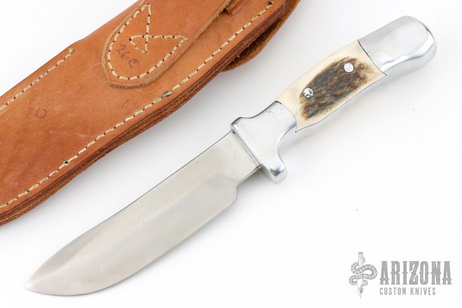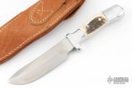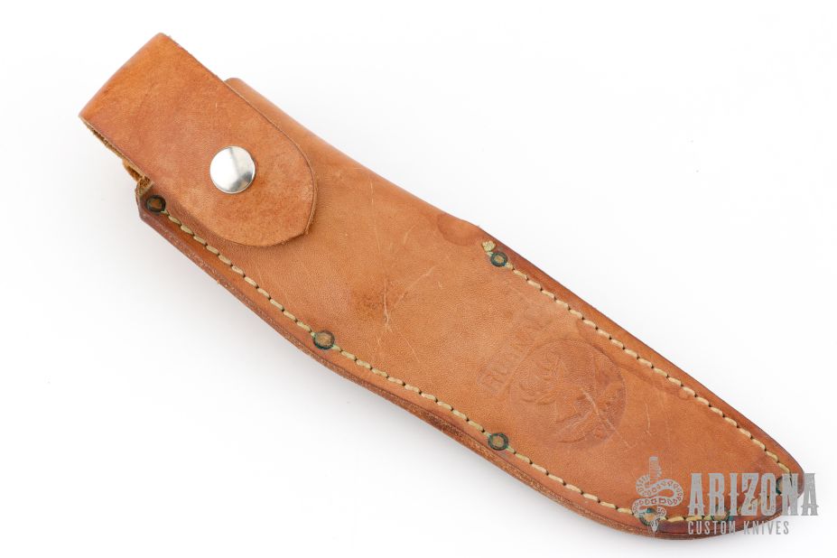 This Model 26CD Semi-Skinner by Rudy Ruana features a satin finished blade with false top edge, .176" blade stock and 1.241" blade depth, hidden tang construction. The handle is cast from aluminum with elk inserts. Comes with brown leather sheath. Excellent condition.