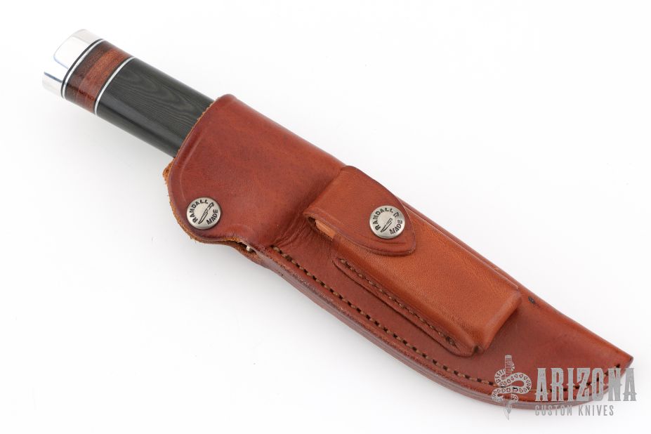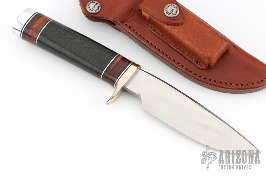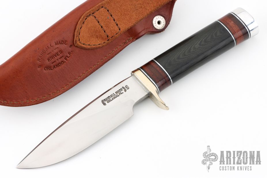 The Model 25-5 by Randall Made Knives is a drop point hunter similar to Model 11, but handle construction is reminiscent of 1930′s design. Excellent skinning, outdoors knife. This knife has a stainless steel blade with notched thumbrest, .236" blade stock and 1.246" blade depth, hidden tang construction. The handle nickel guard and duralumin pommel, black linen micarta grip with stacked leather, black and duralumin spacers. Comes with brown leather sheath. Excellent condition.