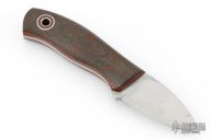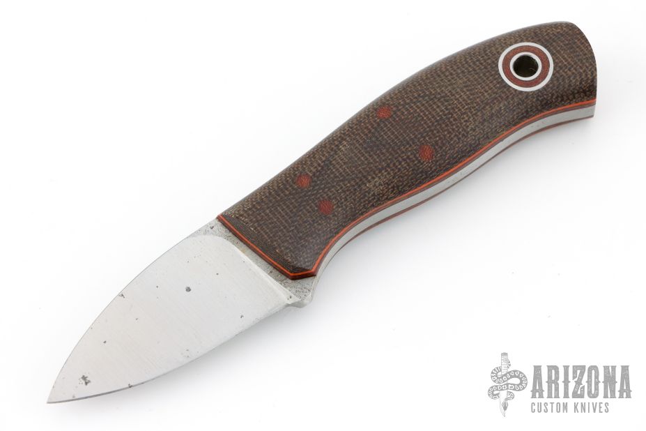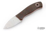 This Runt by Fiddleback Forge features a drop point blade, spalted flats, satin bevels, .157" blade stock and .929" blade depth, full tang construction. The handle has canvas micarta scales, brown micarta/orange g10 liners, brown micarta pins and lanyard hole. Has a couple spots on the blade otherwise, Excellent condition.