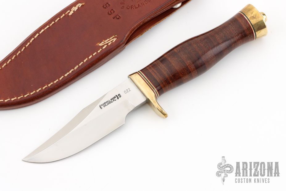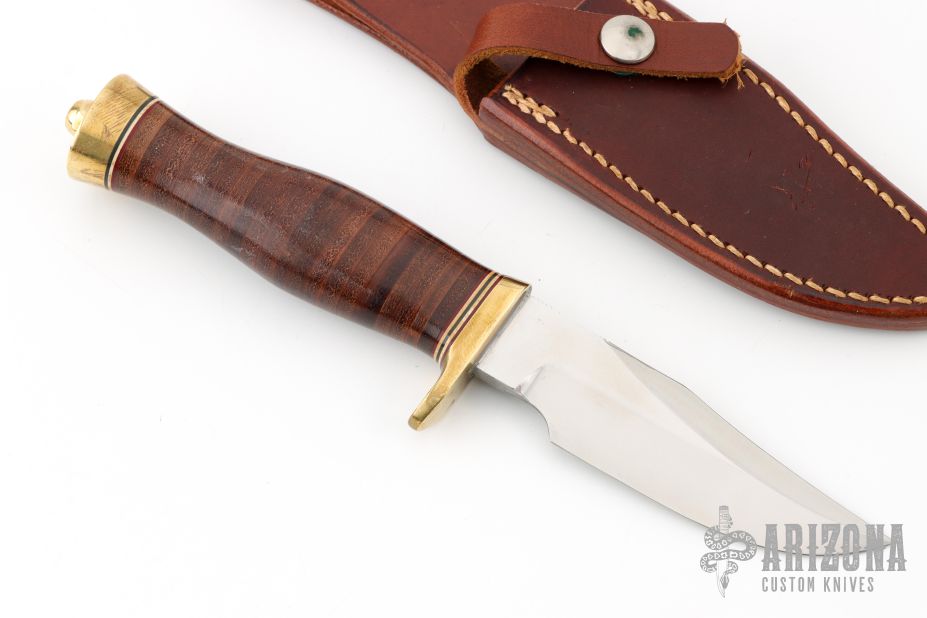 This Stanaback Special features a stainless steel blade with sharpened top edge and notched thumbrest. Handle is "commando style" stacked leather grip with red/white/blue spacers, and brass single hilt and pommel. .228" blade thickness and 1.104" blade depth, hidden tang construction. Includes a brown leather sheath. Excellent condition. #022