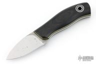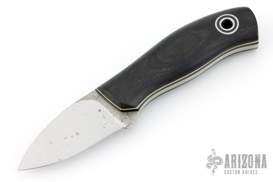 This Runt by Fiddleback Forge features a drop point blade, spalted flats, satin bevels, .126" blade stock and .927" blade depth, full tang construction. The handle has canvas micarta covers, yellow/black g10 liners, black micarta pins and lanyard hole. Has a couple spots on the blade otherwise, Excellent condition.