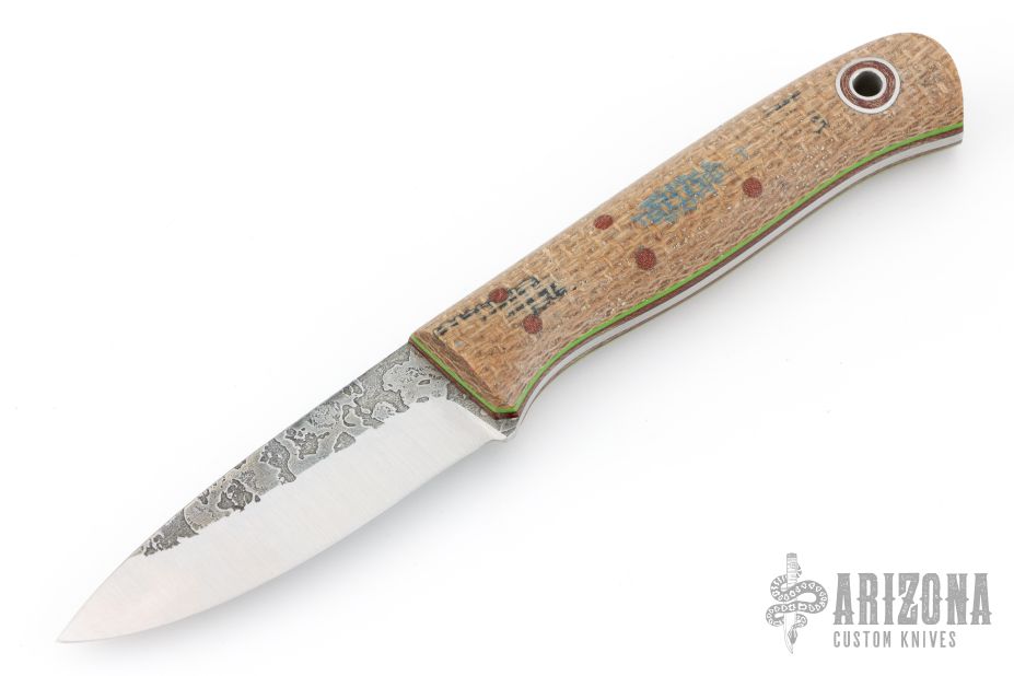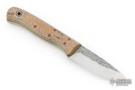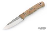 This Hiking Buddy by Andy Roy features a drop point blade with satin grinds and spalted flats, .093" blade stock and .937" blade depth, full tang construction. The handle has burlap micarta scales, brown micarta/green G-10 liners, brown micarta pins, and lanyard hole. Has a couple light spots on the blade, otherwise Excellent condition.