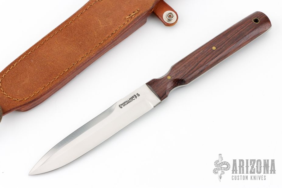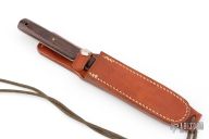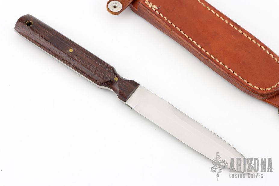The Model 10-5 by Randall is a Crider Special with spearpoint stainless blade with notched thumb and finger rests, sharpened top edge, .124" blade stock and .877" blade depth, full tang construction. Double finger groove and a rosewood handle with brass pins. Brown leather sheath is stamped "Jack Crider Special". Excellent condition. Hard to find.