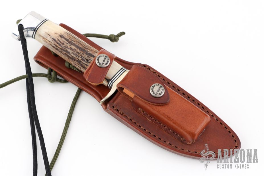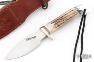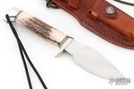 The Model 11 is the original drop-point blade. Designed by Tommy Thompson, noted Alaskan guide, in 1952 for big-game skinning, with point dropped below top of blade to prevent cutting too deeply through skins when used point first. This knife has a satin finished blade with notched thumbrest, .159" blade stock and 1.320" blade depth, hidden tang construction. The handle has a nickel silver guard and duralumin butt with lanyard hole, stag grip with black/duralumin spacers. Comes with a brown leather sheath. Has a couple of small oxidation spots on the blade, otherwise excellent condition.