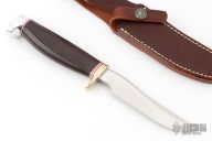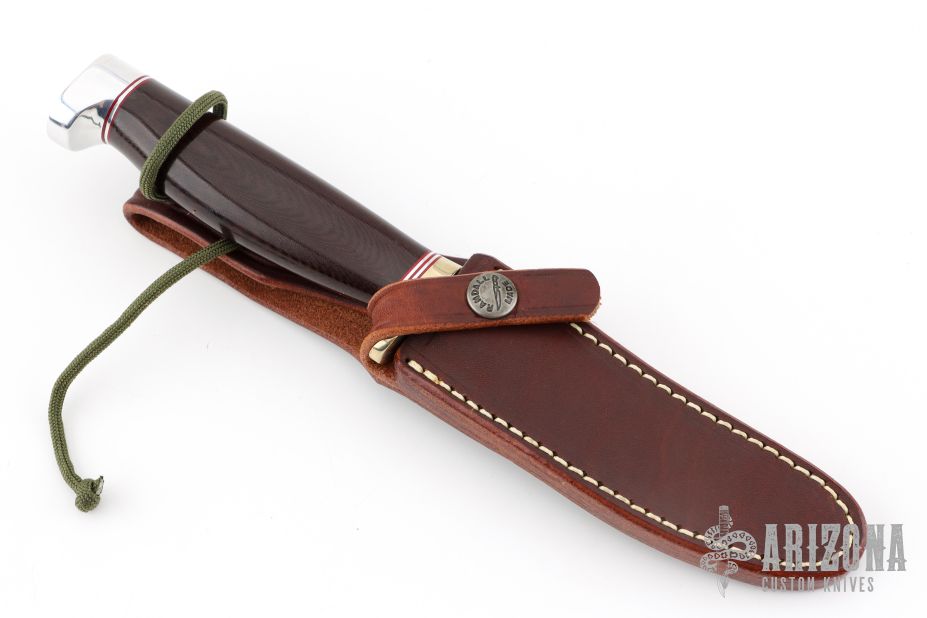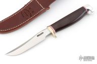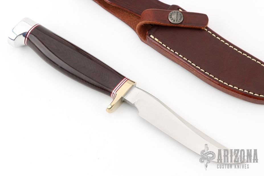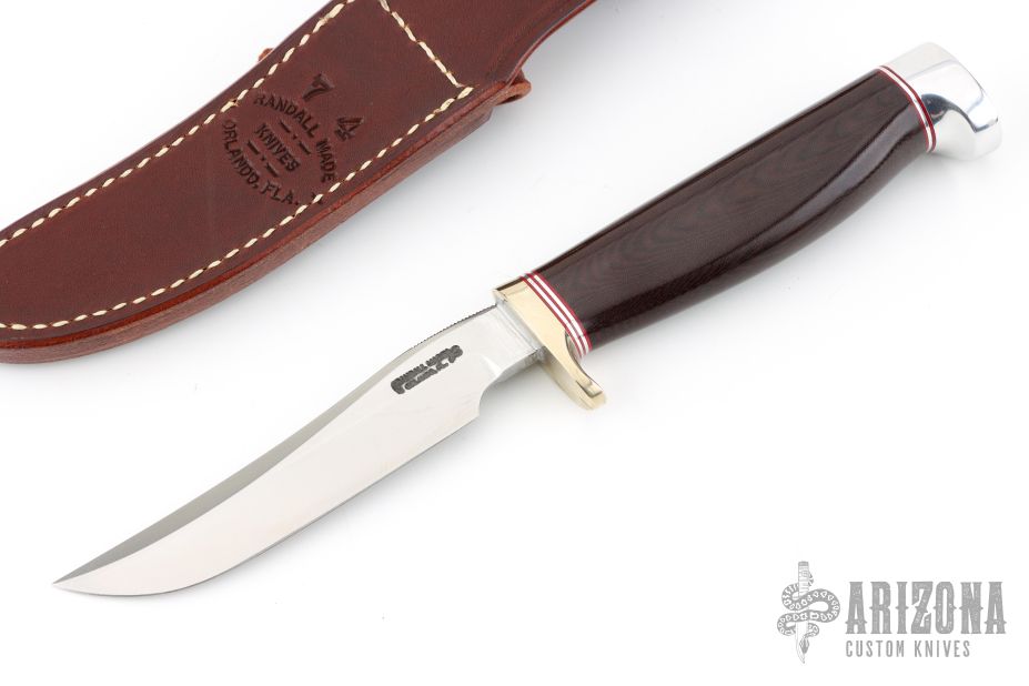 This Model 7-4 by Randall Made Knives features a satin finished upswept blade with notched thumbrest and false top edge, .173" stock and .875" blade depth, hidden tang construction. The handle has a nickel silver guard with red/duralumin spacers, duralumin butt and a maroon linen micarta grip. Comes with brown leather sheath. Excellent condition.