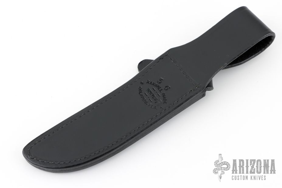 Black Leather Randall Sheath Model 3-6. This one is stamped "R" which I think means replacement. Excellent condition.