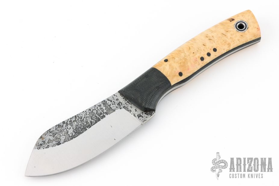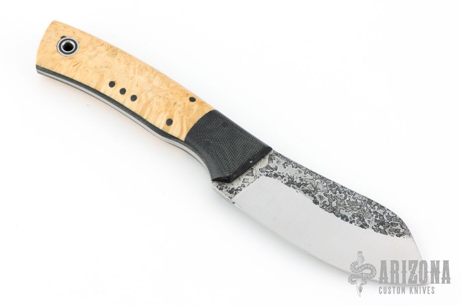 Hi, I am Andy Roy, the maker at Fiddleback Forge, LLC. I started making knives in 2007, and went full time May 1, 2009 when I got laid off of my last engineering position. I consider myself a toolmaker, and much of the focus of my work is in the handle. I strive to make the most comfortable handle you?ve ever held. It is important to me that you can hold the knife in many positions comfortably and do hard extended work with the blade. I also think it is important for the handle to index the knife in your hand, so that no matter how you hold it, you know where the edge is without having to look. I use a variety of steels, and my favorite grinds are convex, and Scandi. In 2010 I spent a lot of time developing a finish treatment for the flats of my knives that I call 3D Spalted Steel. It adds a unique character to my blades, and I think it complements the refined handle work well. I am very excited to be working with Arizona Custom Knives, and hope you enjoy the Fiddleback Forge knife you buy from them.